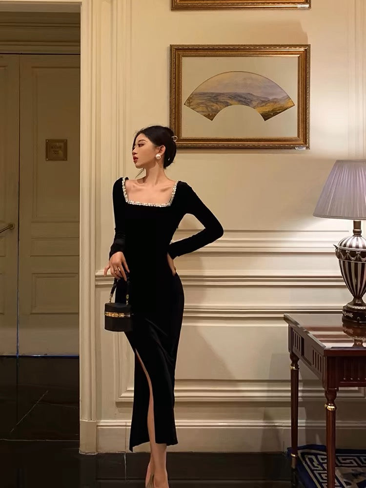 French Sheath Square Neckline Black Prom Dresses Birthday Outfits Evening Gown SD1039