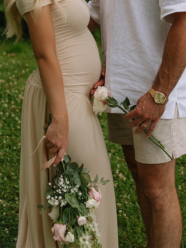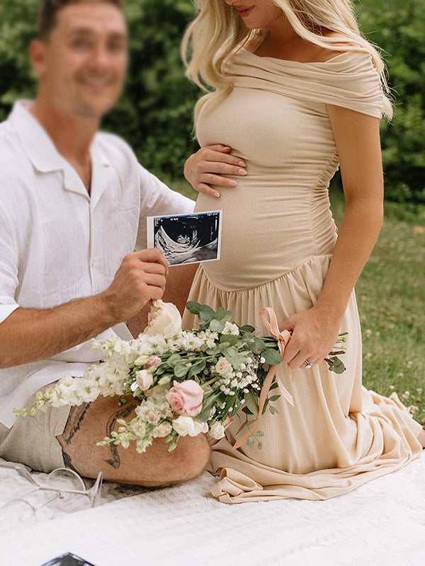 Apricot Off Shoulder Ruched Backless Boat Neck Cap Sleeve Splicing Elegant Boutique Holiday Gowns Photoshoot Maternity Maxi Dress Maternity