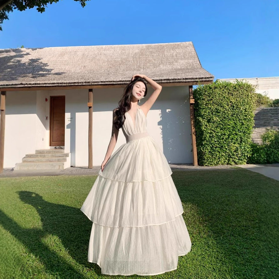 Holiday Atmosphere Feel Dress Women Folded Deep V Hanging Neck Dress Pure Lusty Style Big Back Cake Dress