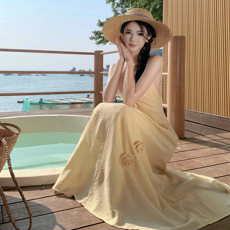 Summer New French V-Neck Hanging Neck Sling Skirt Loose Seaside Holiday Dress Woman