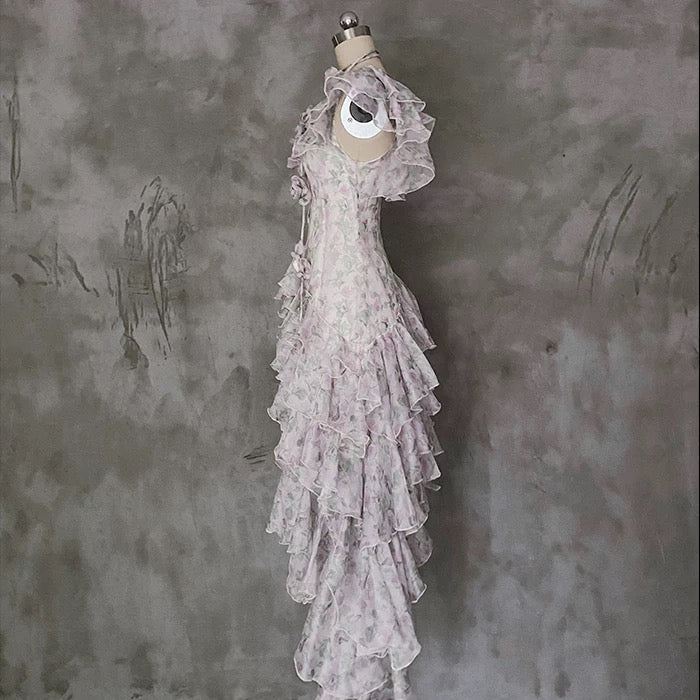 A Line Scoop Short Sleeves Floral Ruffles Prom Dresses Birthday Dress For Women SD253
