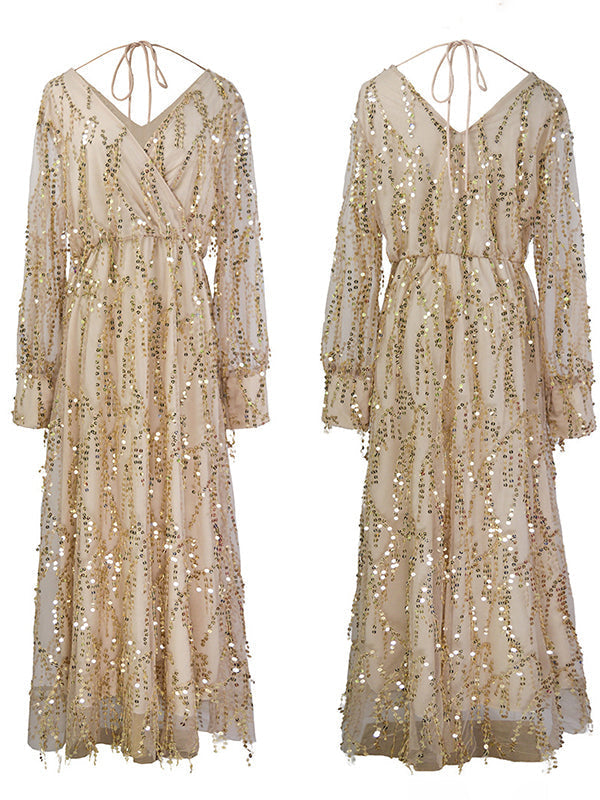 Apricot Sequin Tassel Tulle Ruched Cross Chest Multi Way Tie Back V-neck Elegant Boho Photoshoot Maternity Maxi Dress Maternity