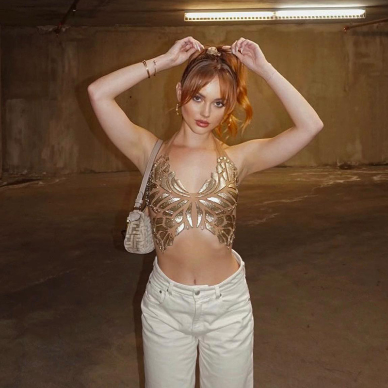 Butterfly Foam Printed Sling Vest 2025 New V-Neck Open Umbilcles DJPT