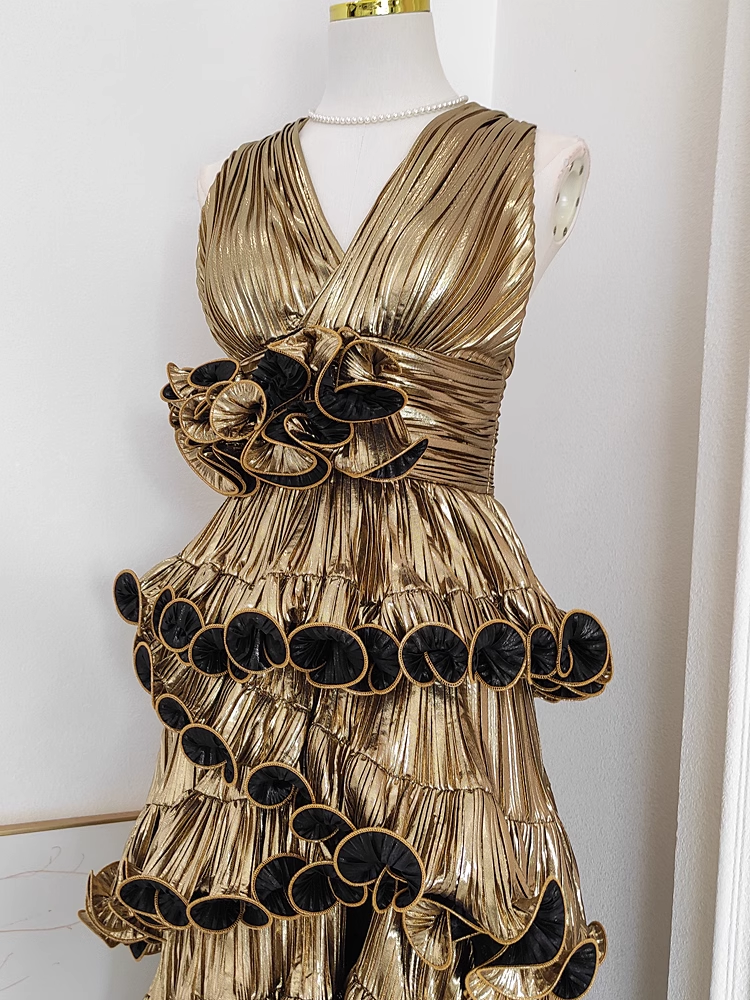 Sheath V Neckline Gold Ruffles Long Prom Dresses Birthday Outfits SD367