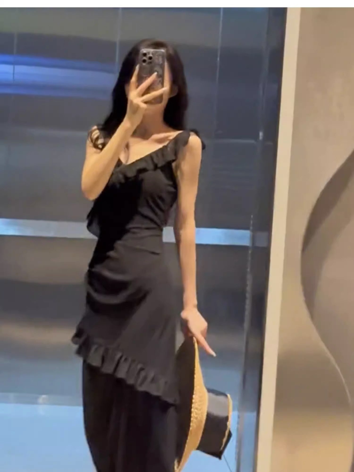 Sheath V Neckline Ruffled Black Chiffon Beach Dress Women's Vacation Dresses SD1140
