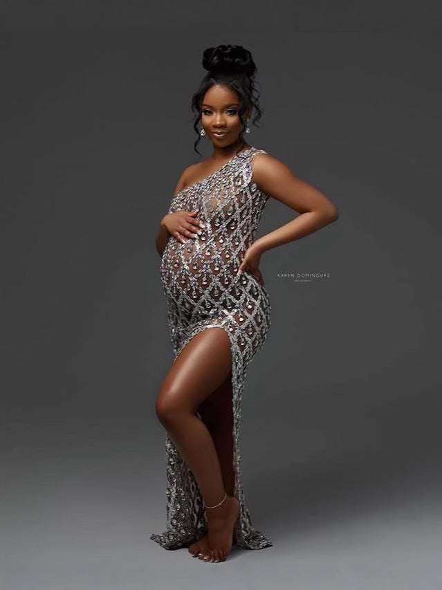 Summer Luxury Hot Diamond Pregnant Women Photo Dress Oblique Shoulder Slit Drill Pregnant Woman Photography Dress Maternity