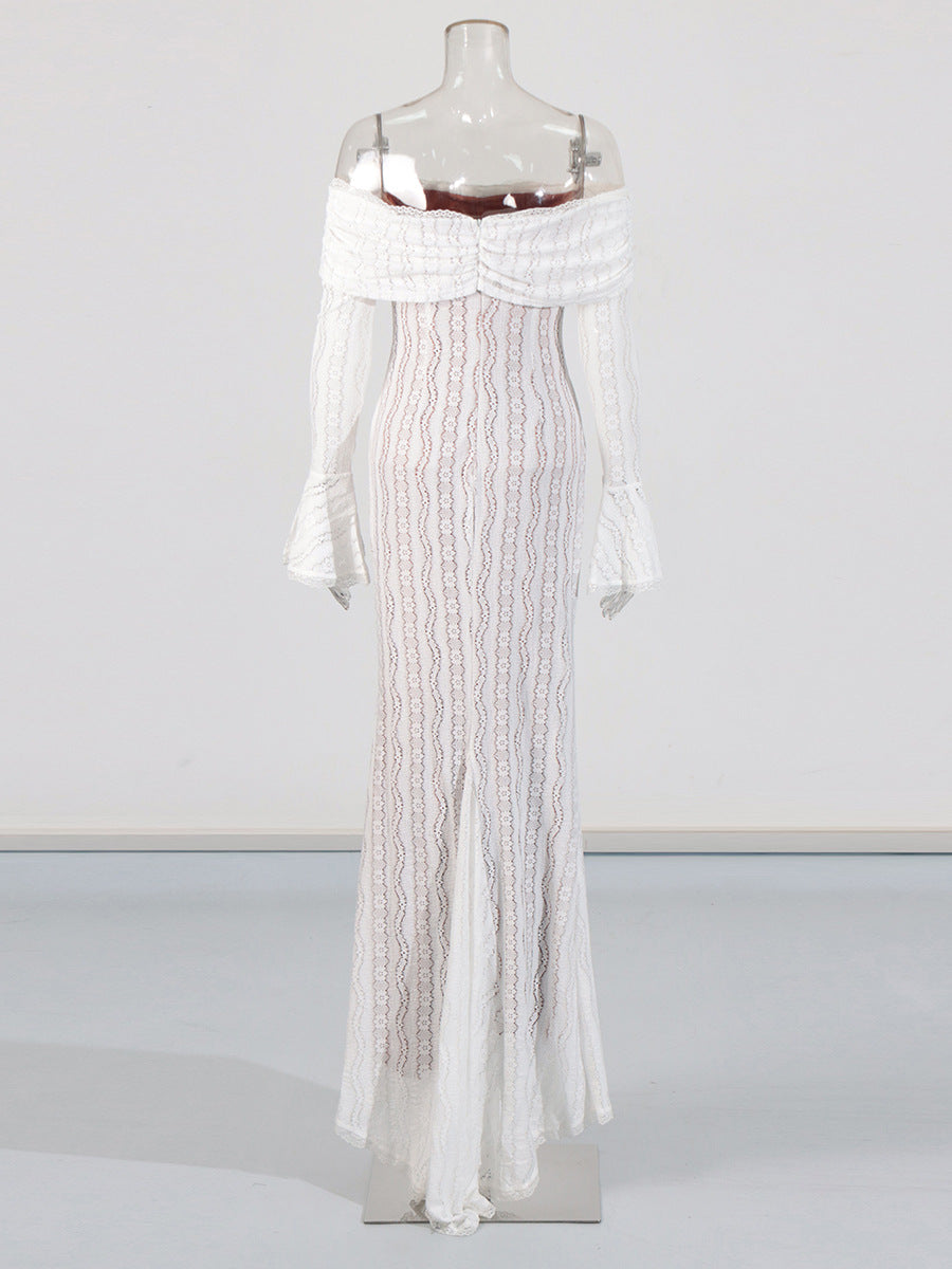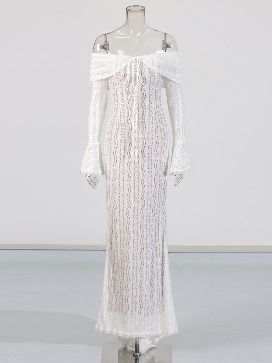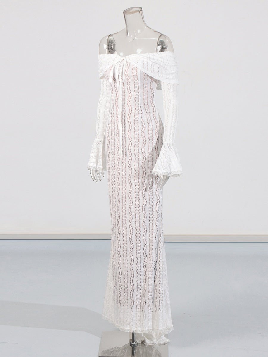 Temperament French Retro Wind Tailing Dress 2025 Summer Season New Word Shoulder Long-Sleeved Lace Hollow Dress