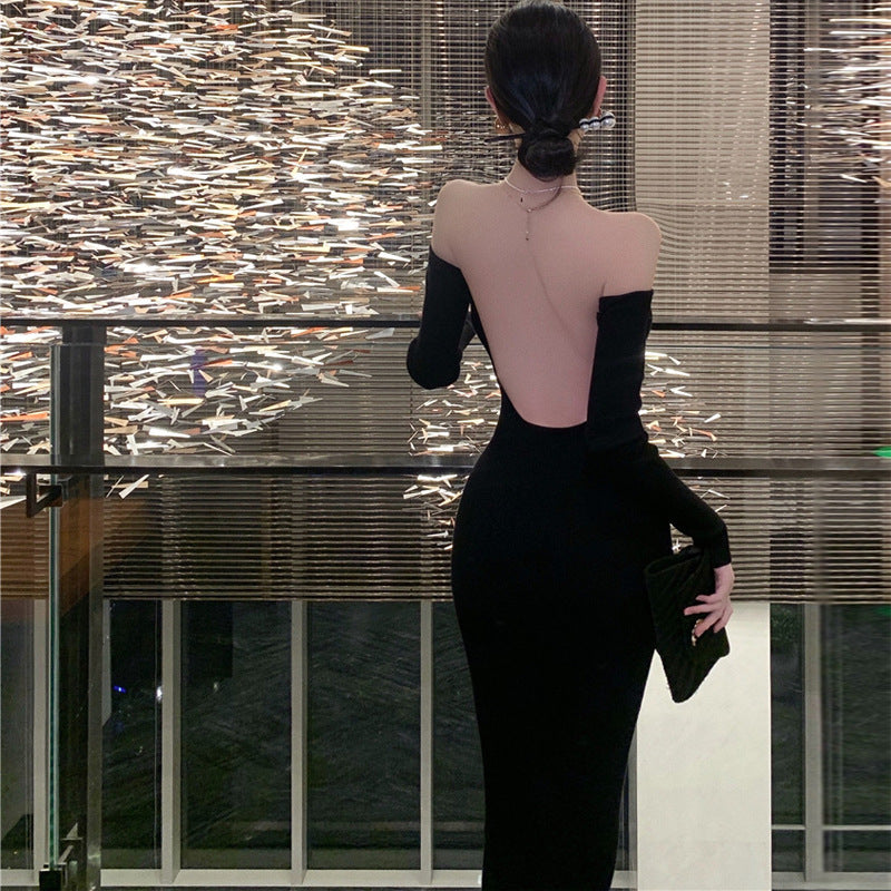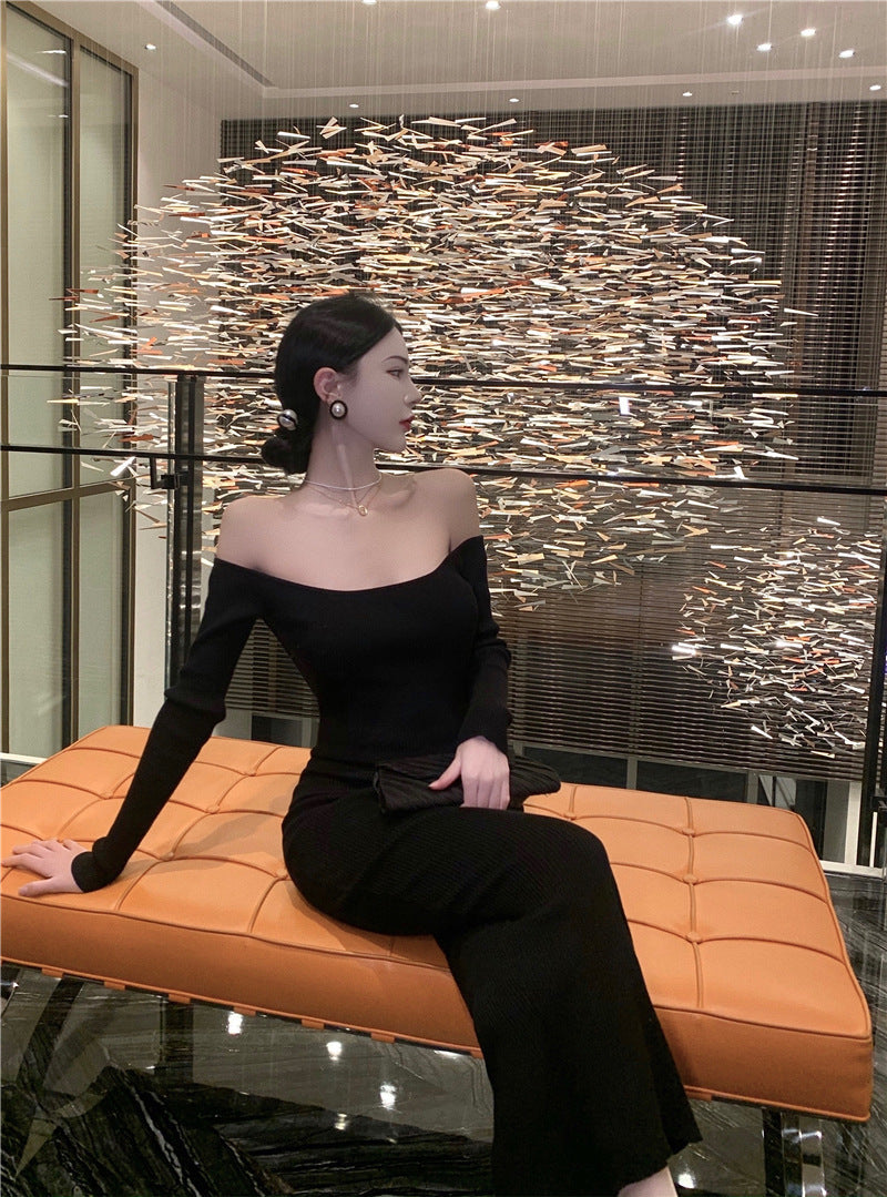 Big Show Back Black Brooch Knitted Dress High-End Famous Temperament Pure Shoulder Dress Dress