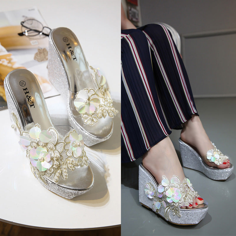 Cool Slippers Shop Hundred Korean Version Of Fashion Beaded Flowers Summer Transparent Slope And Thick Bottom Slippers High Quality Shoes