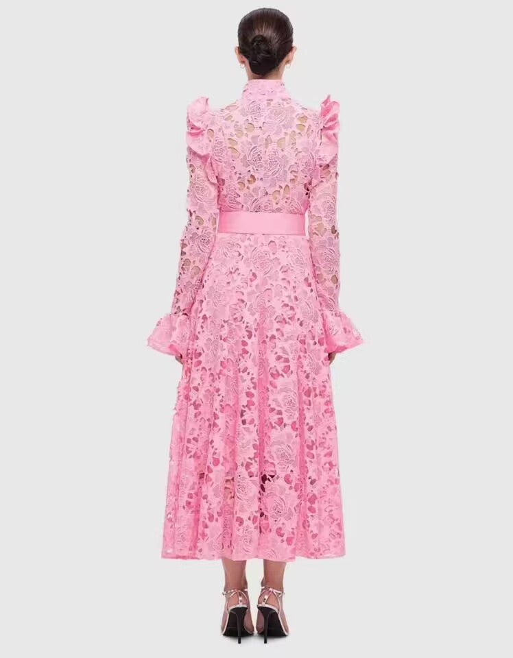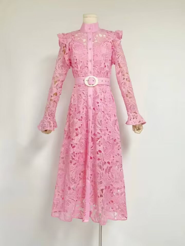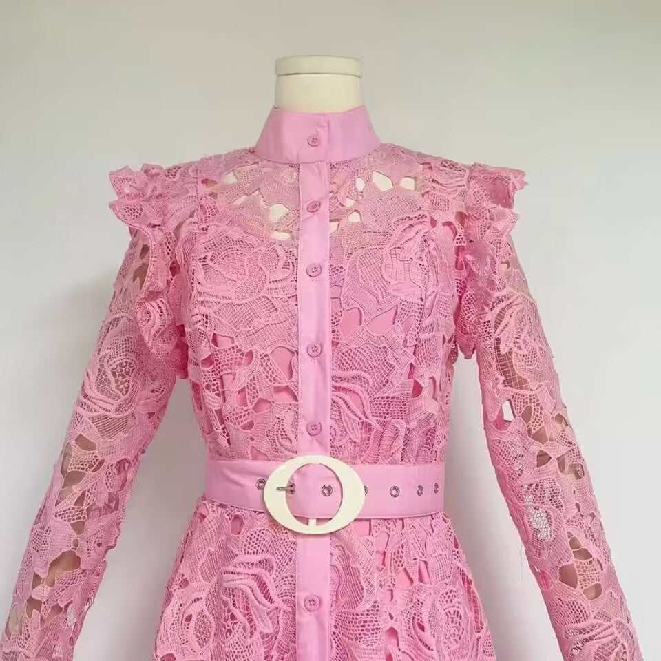 Dress Dress With Lotus Leaves With Belt Famous Temperament Sweet Water-Soluble Lace Dress Dress Dress