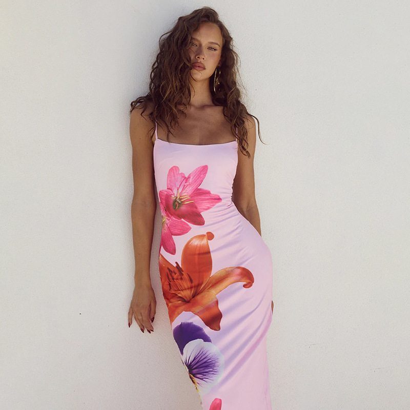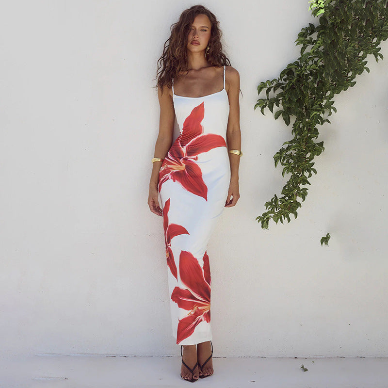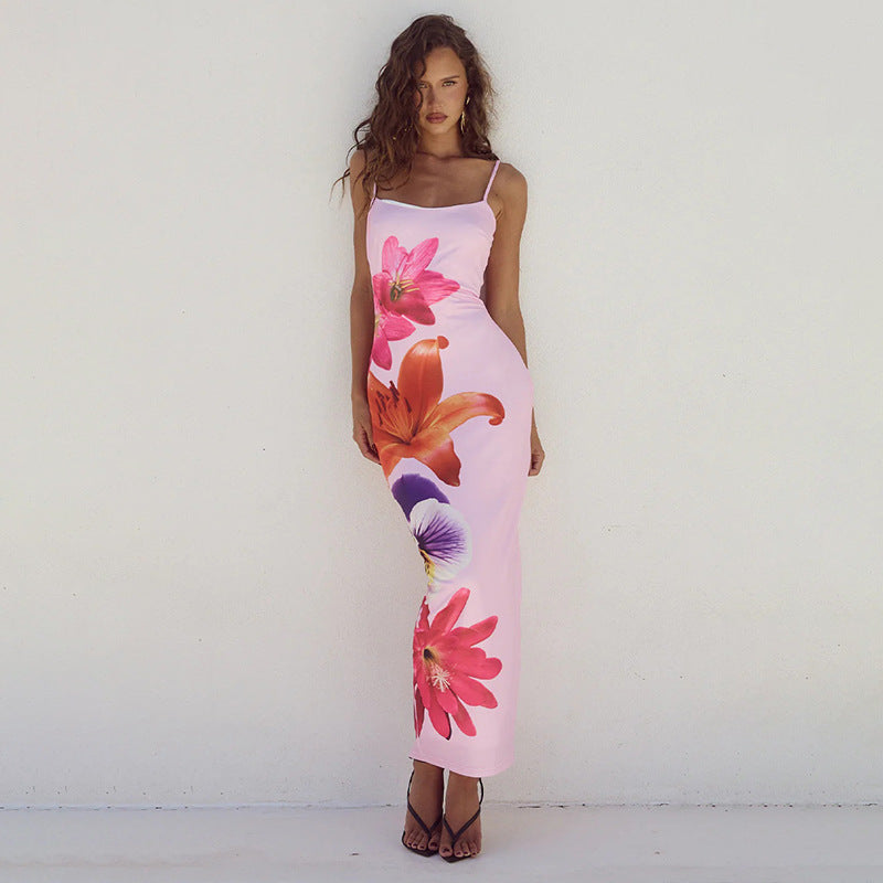 Hanging Flower Print Sexy Dress 2025 Summer New Hot Girl De-Backed Long Dress Girl DJPT