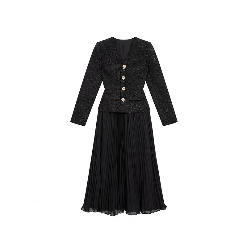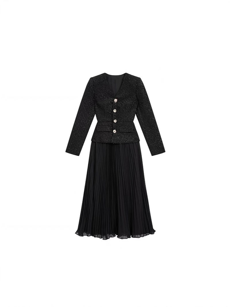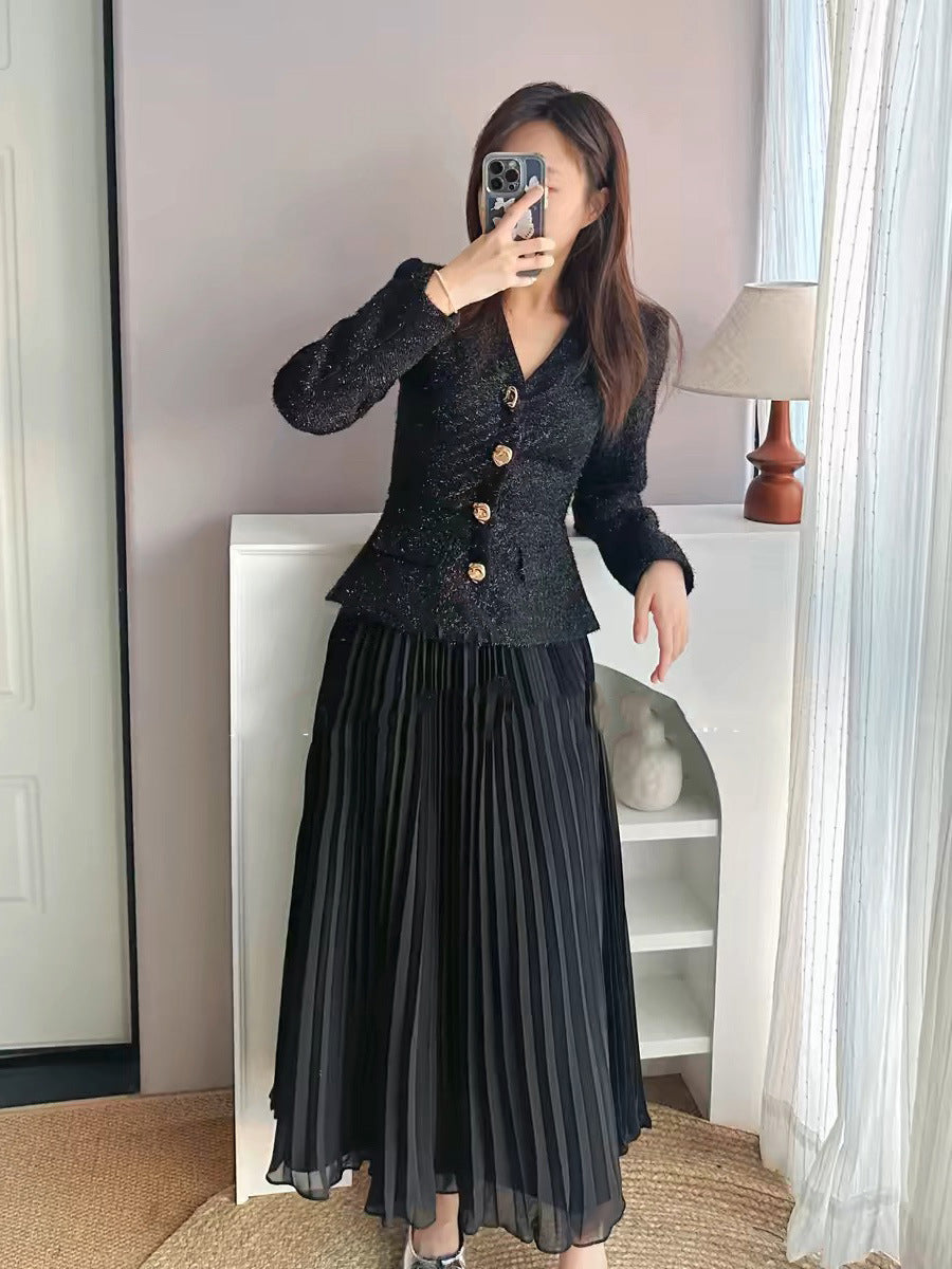 Luxury Black Little Fragrant V-Neck Blouse In The Fall Of 2024, The New Temperament Of The 100-Folded Skirt Two-Set