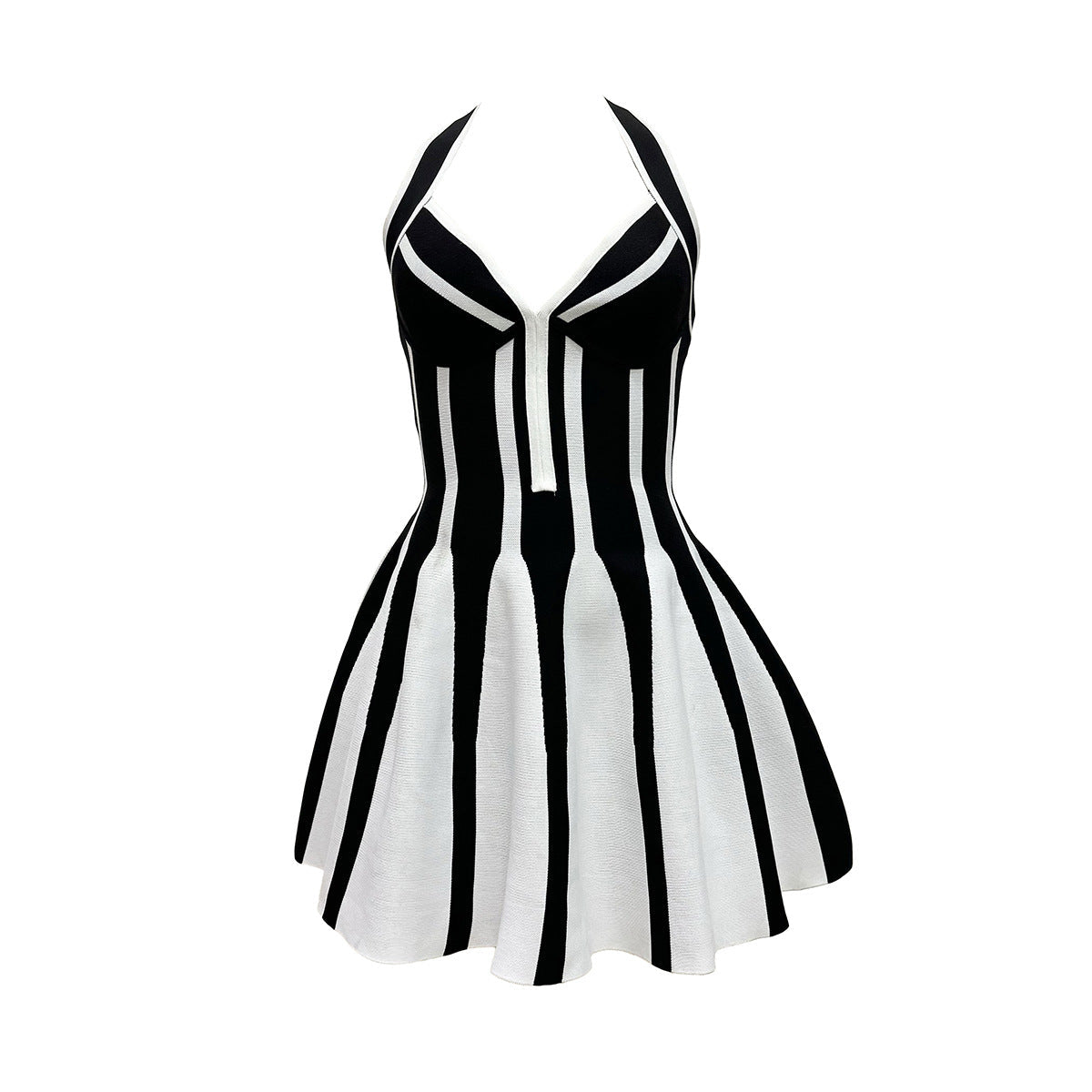 New Women's Sexy Black And White Stripe Hanging Back Hanging Neck Knitted Banded Dress