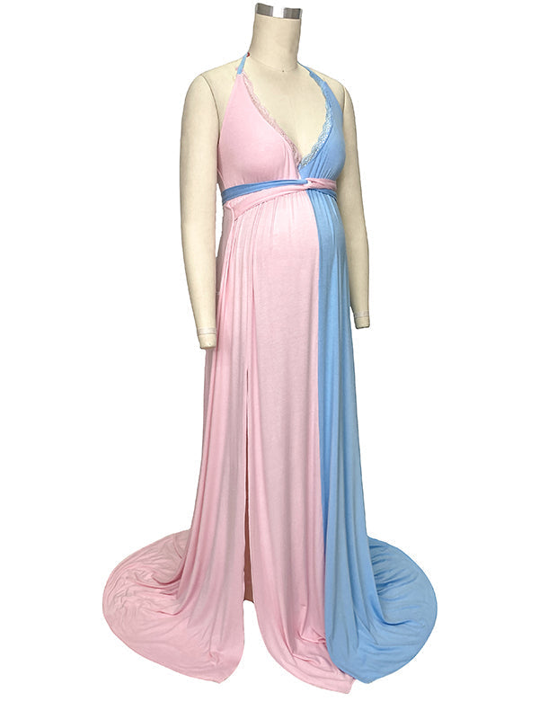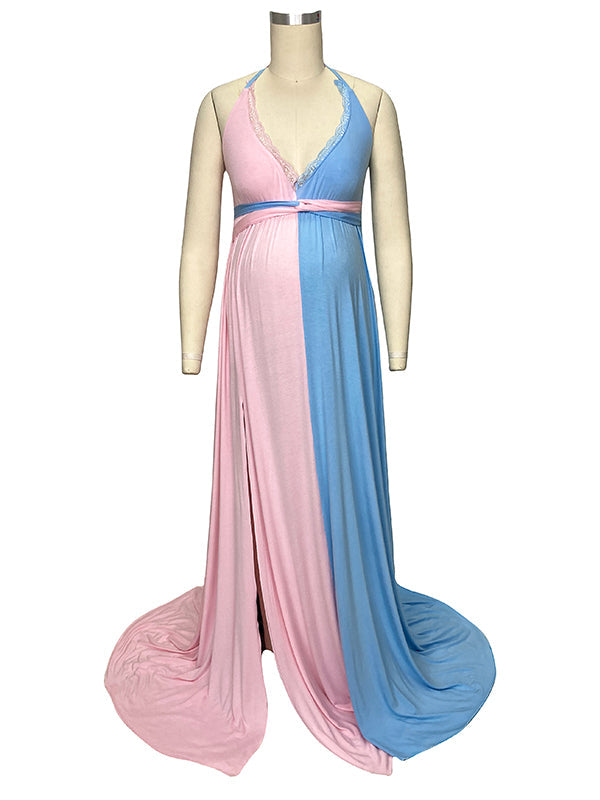 Pink&Blue Lace Backless Side Slit Gender Reveal Cute Maternity Maxi Dress Maternity