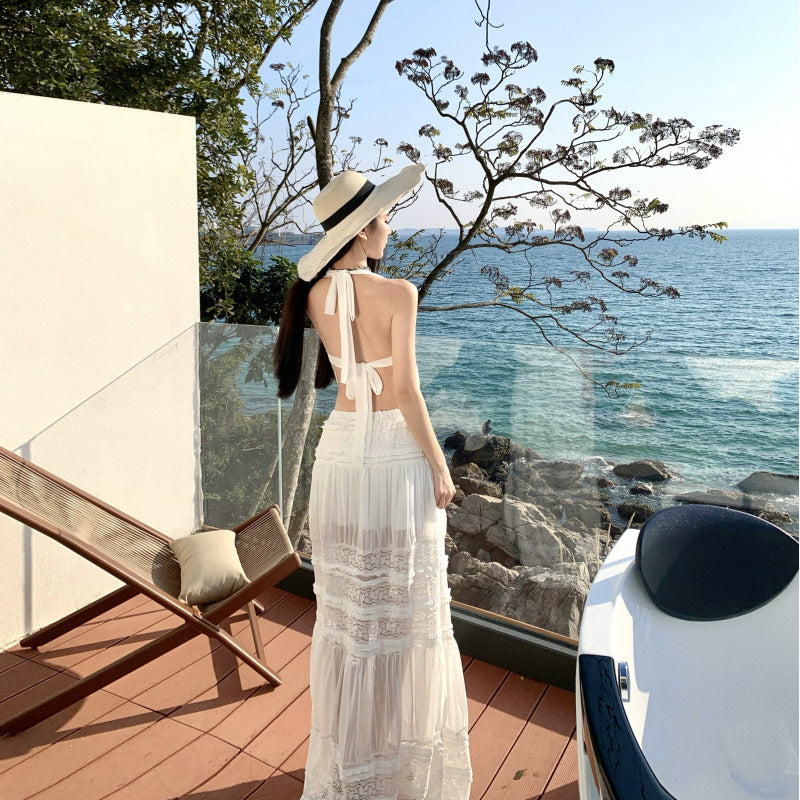 Pure Hottie Style V-Neck Hanging Neck Lift Sling Lace Skirt Two Sets