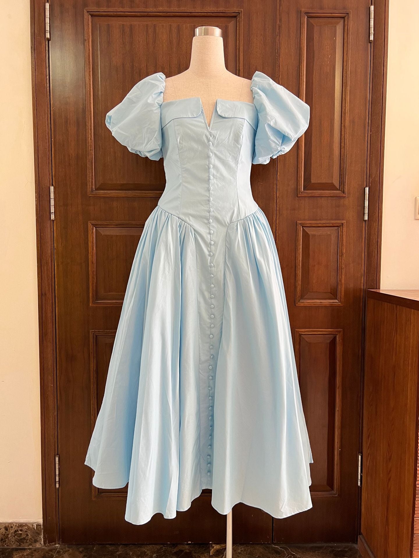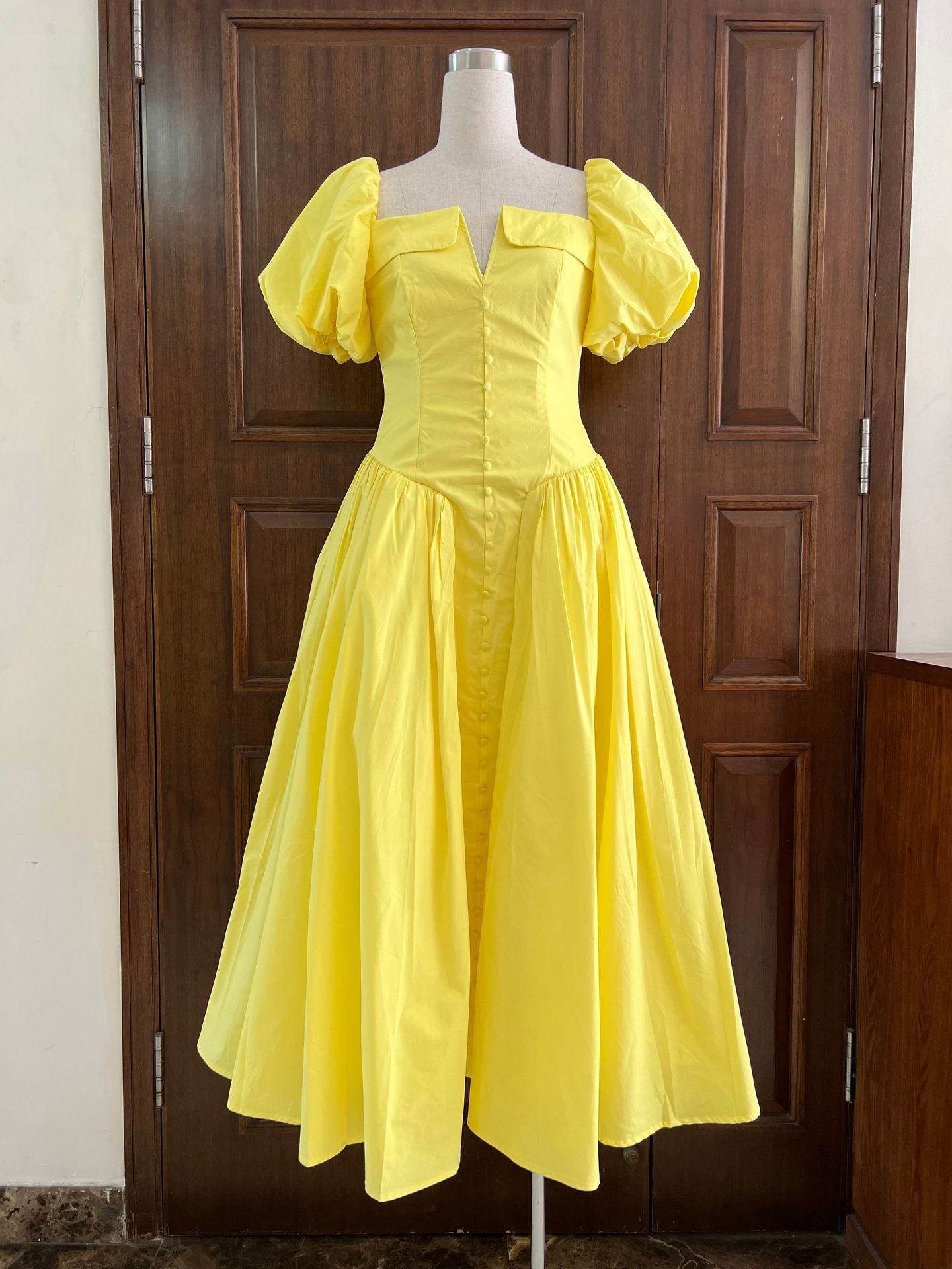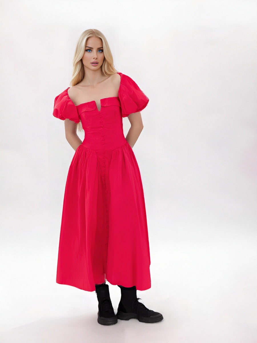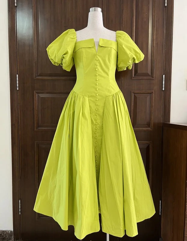 Retro Elegant Style Dress 2025 New Square Collar Bubble Sleeve Fish Bone Pressure Folded Dress Women's Summer