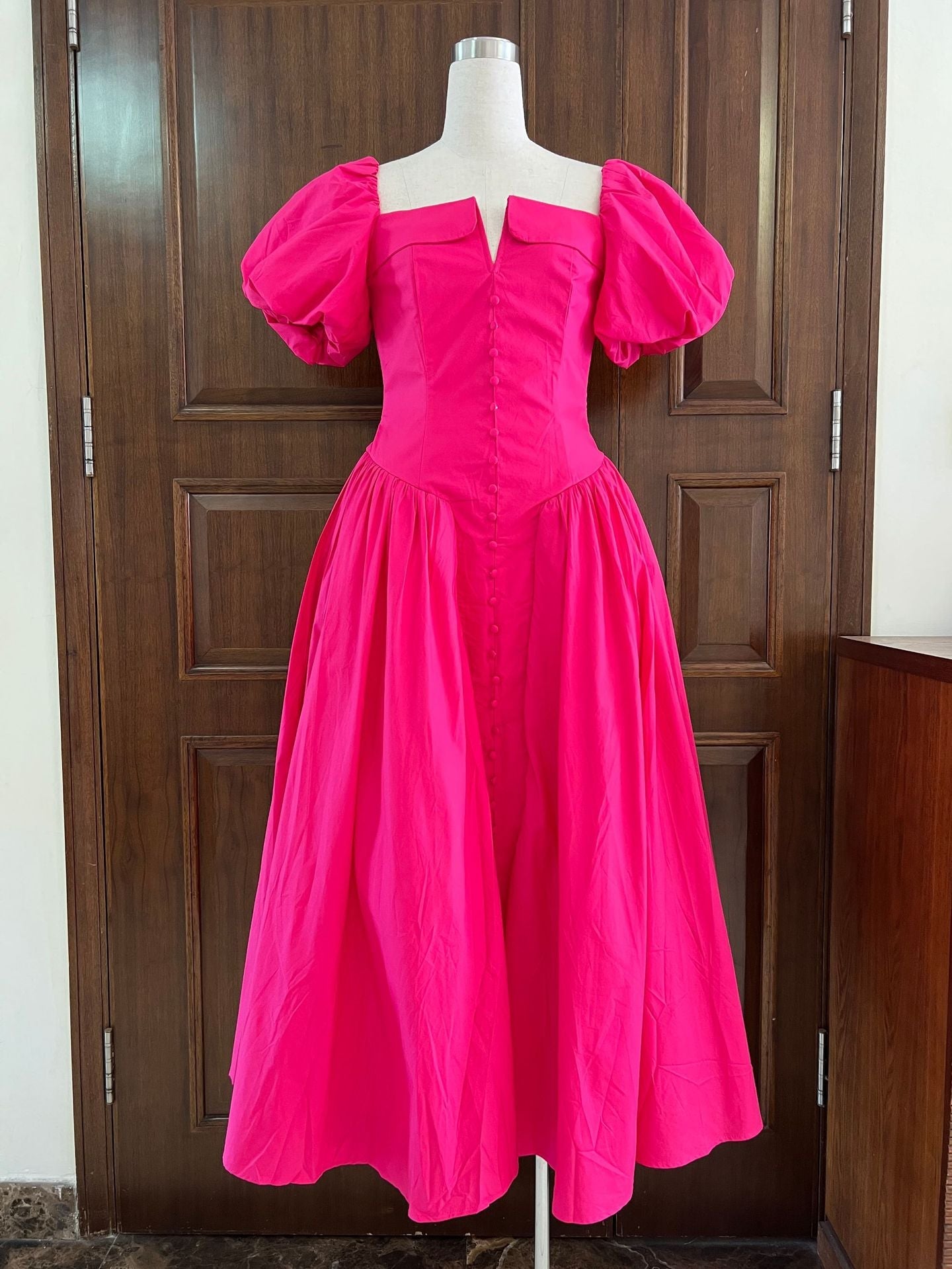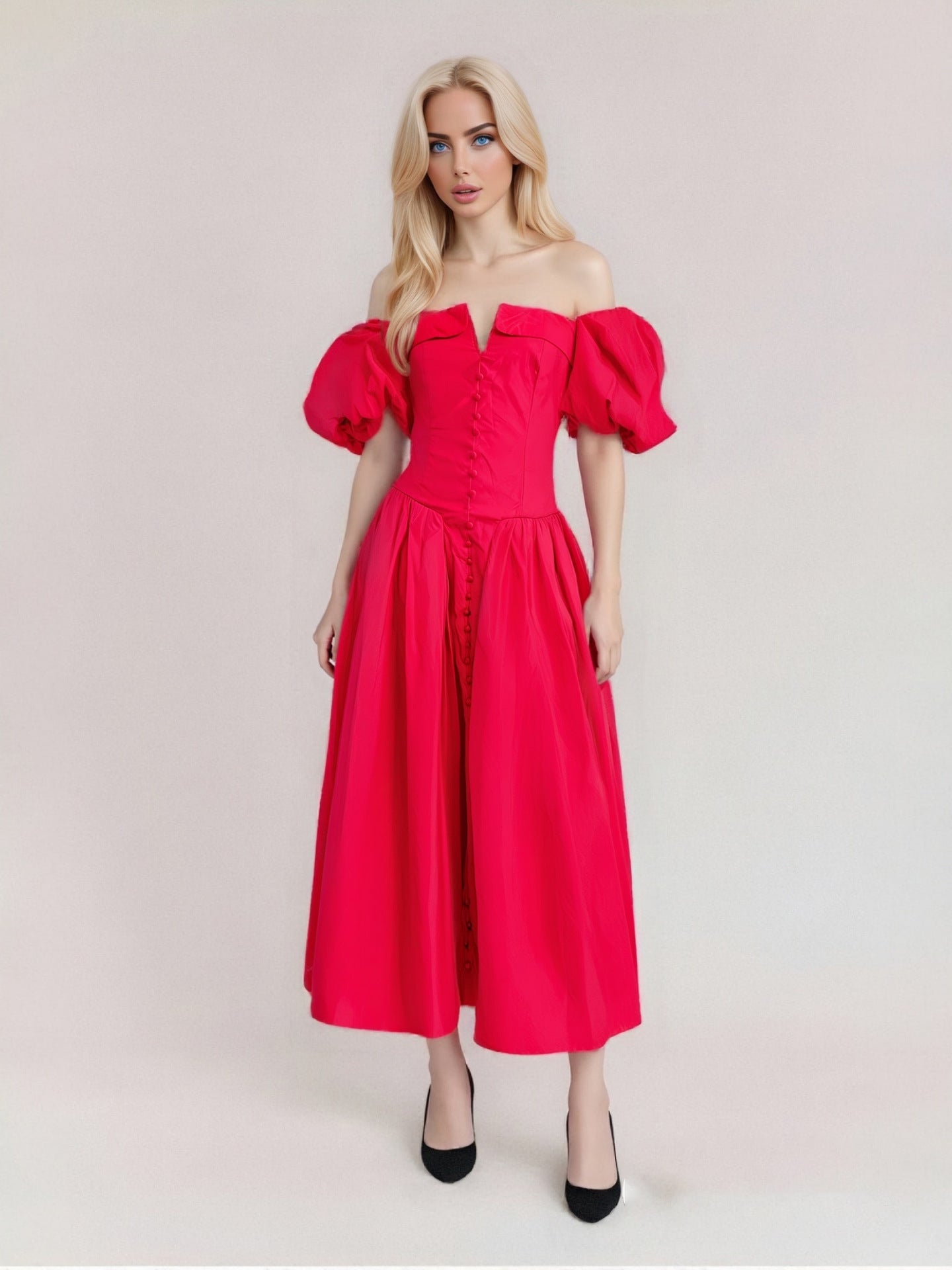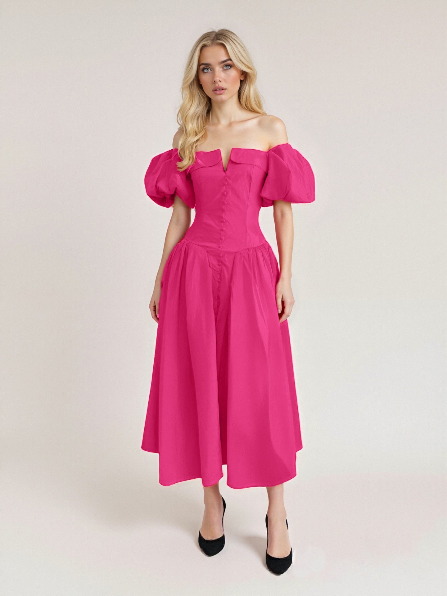 Retro Elegant Style Dress 2025 New Square Collar Bubble Sleeve Fish Bone Pressure Folded Dress Women's Summer