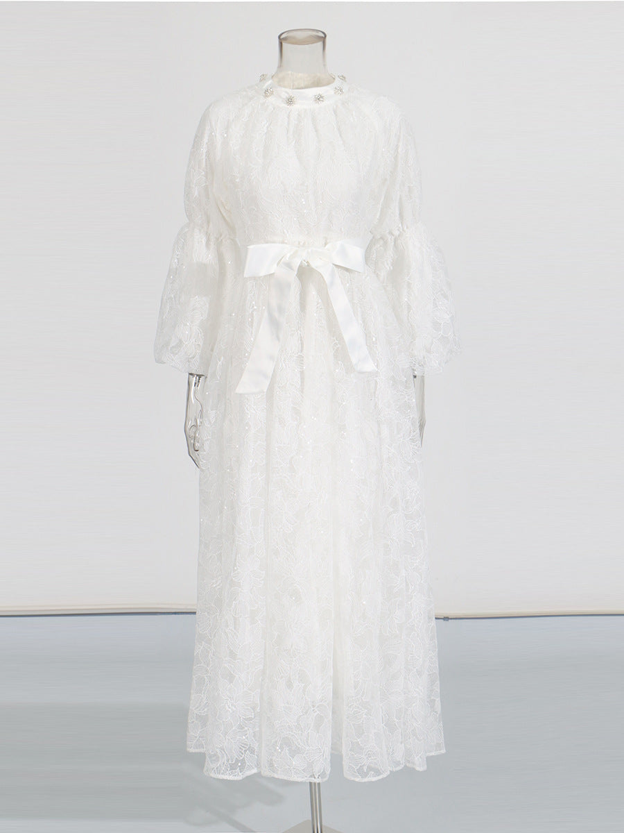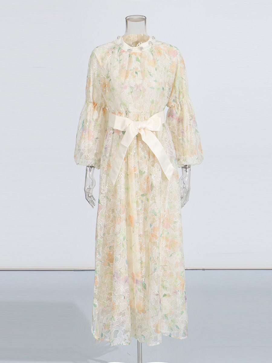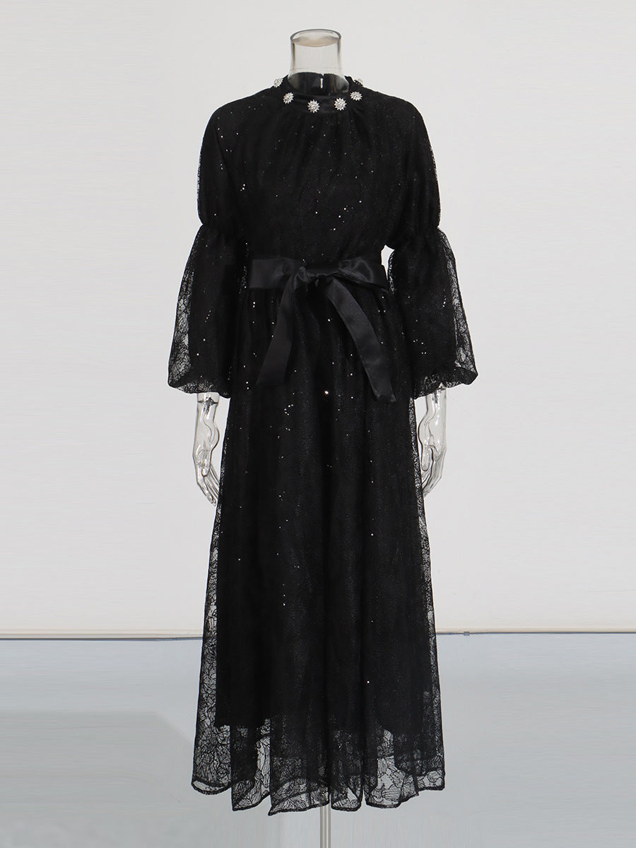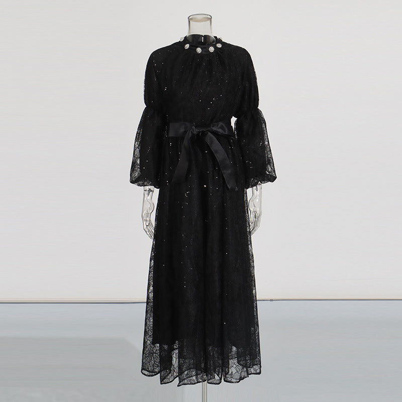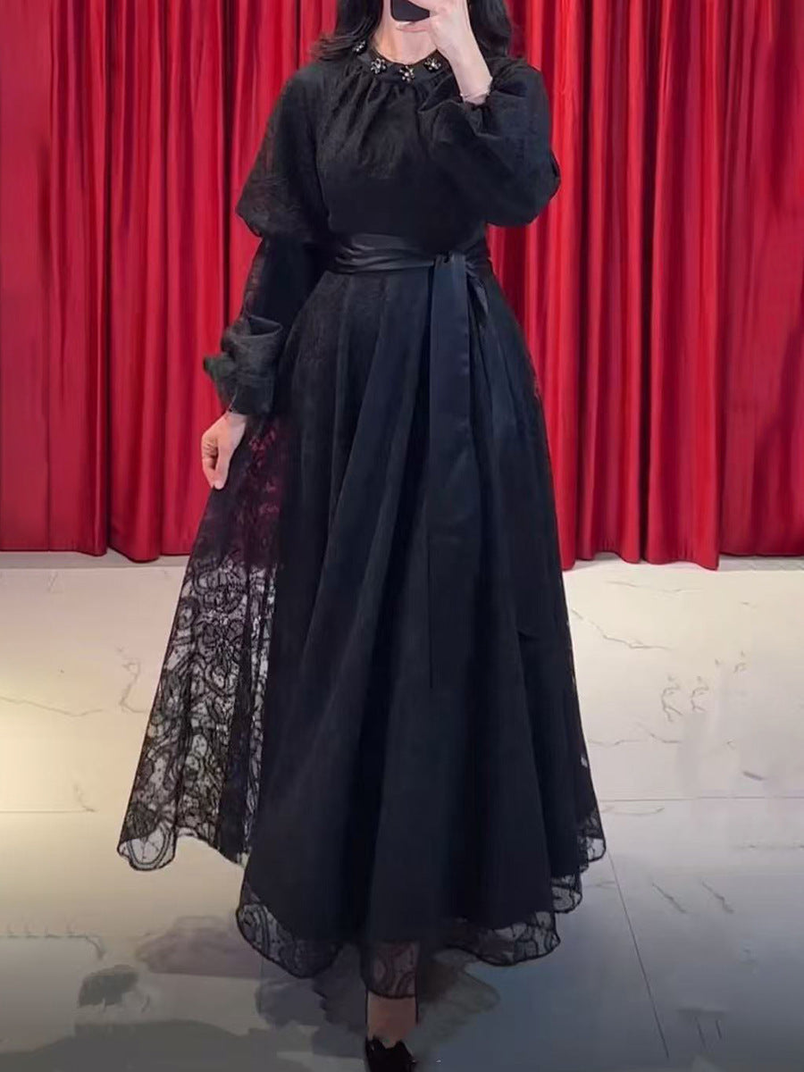 Retro Wind Collared Diamond Splicing Dress 2025 New Women's Summer Lace Yarn Dress