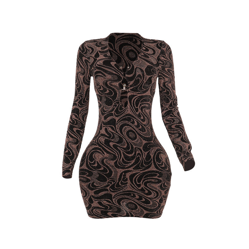 Sexy Deep V-Neck Print Hollow Long-Sleeved Dress Woman 2025 Hottie Body Dress DJPT