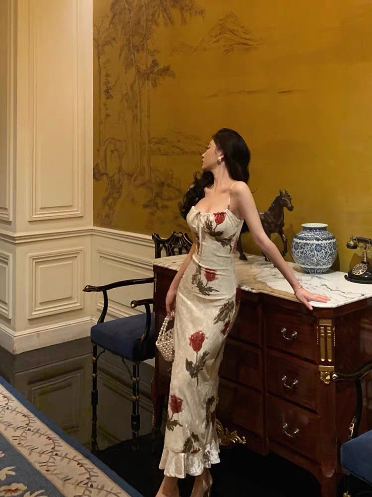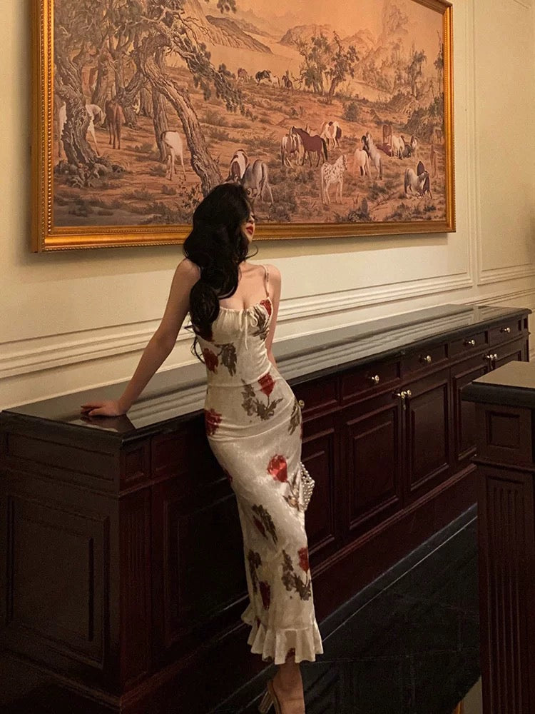Sheath Spaghetti Straps White Satin Red Floral Long Prom Dresses Birthday Outfit SD774