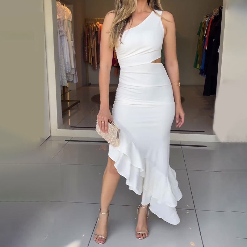 Summer New Slanted Shoulder-Lexed Shoulder-Lexted Sexy Irregular Lotus Leaf Side Skirt
