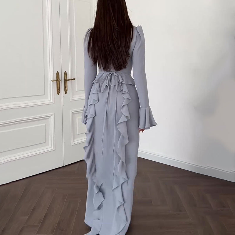 Summer New Splicing Lace Solid-Colored Collar Repair Horn Sleeve Long Skirt