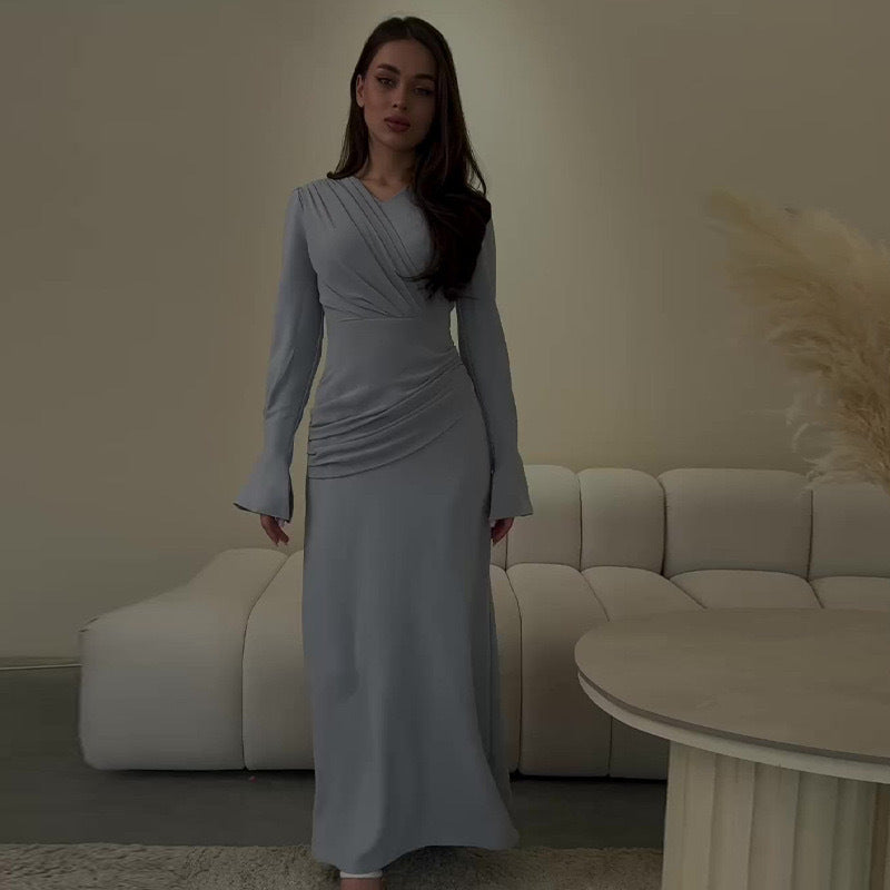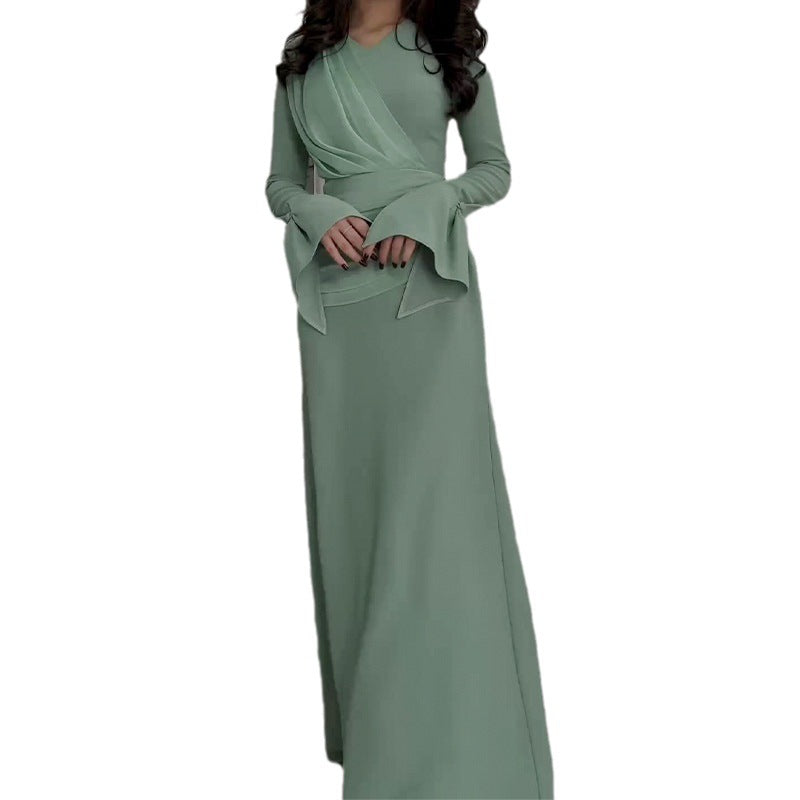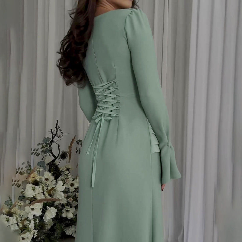 Temperament Micro-Trumpet Folded Cross Superimposed Tying Belt Girded Waist Dressing Spliced High-Waisted Dress