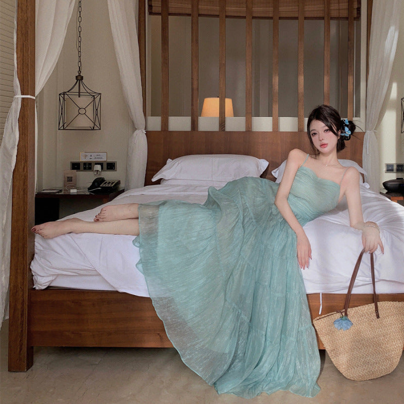 Vacation Photo High-Level Feeling Waist Beach Bare Back Big Skirt Sling A Word Long Dress