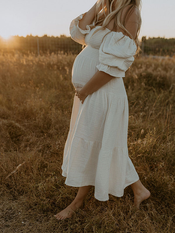 White Ruffle Ruched High Waist Puff Sleeve Cute Photoshoot Maternity Maxi Dress Maternity