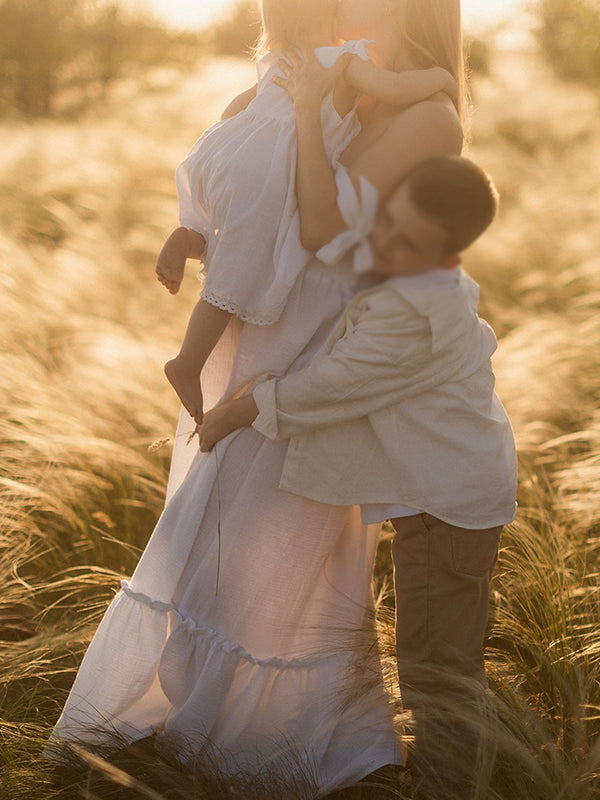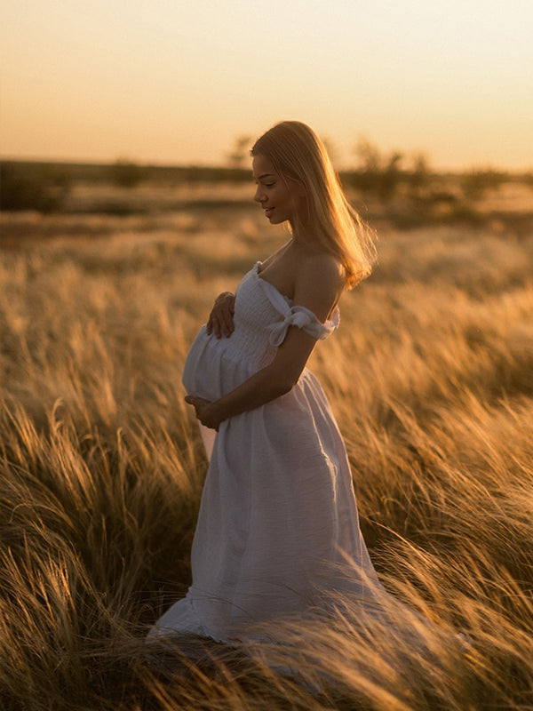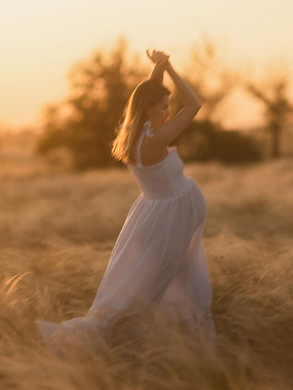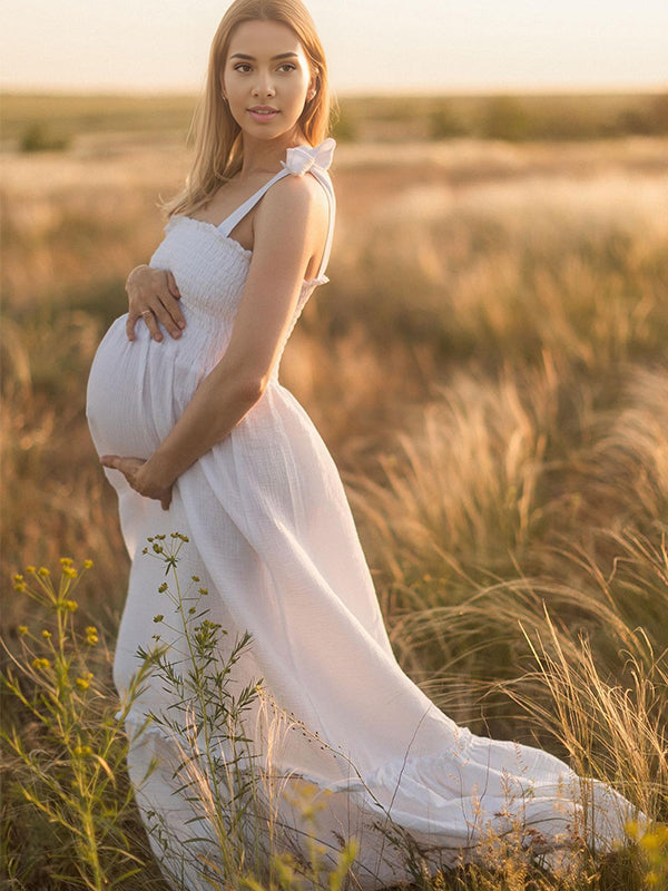 White Smocked Knotted Adjustable Strap Ruffle Falbala Babydoll Shirred Big Swing Elegant Baby Moon Going Out Boho Maternity Photoshoot Baby Shower Maxi Dress Maternity