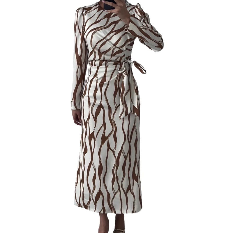 Women's Autumn Round-Neck Graffiti Long-Sleeved Striped Tie Slimming Dress