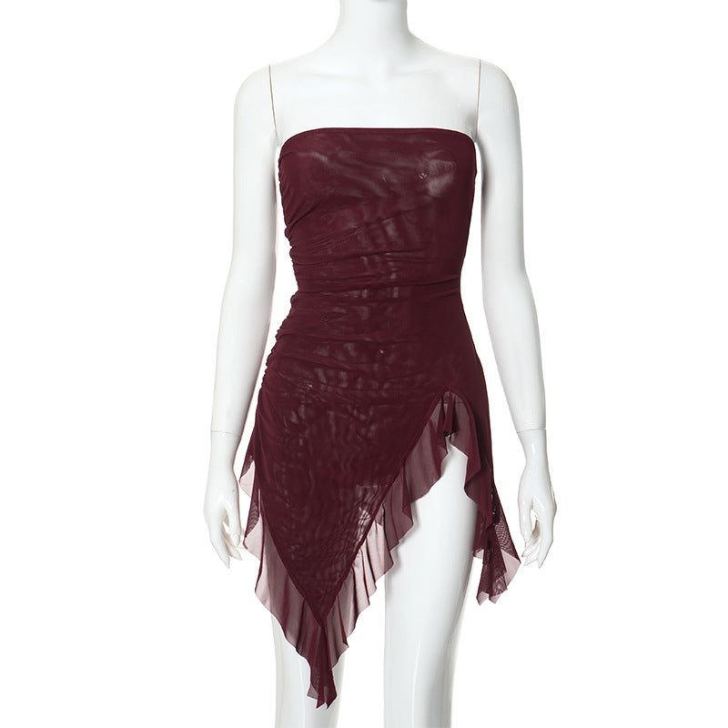 Women's Clothing 2024 New Solid Color Repair Irregular Lotus Leaf Side High-Waist Net Yarn Top DJPT