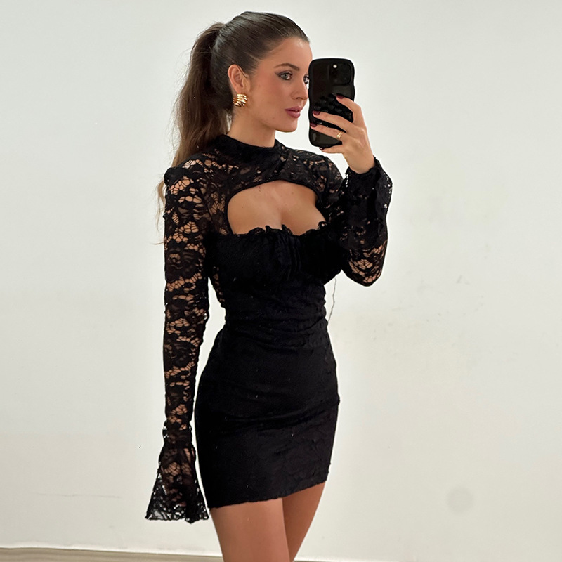 Women's Lace Splicing Chest Hollow Horn Sleeves To Close The Waist Bag Skirt DJPT