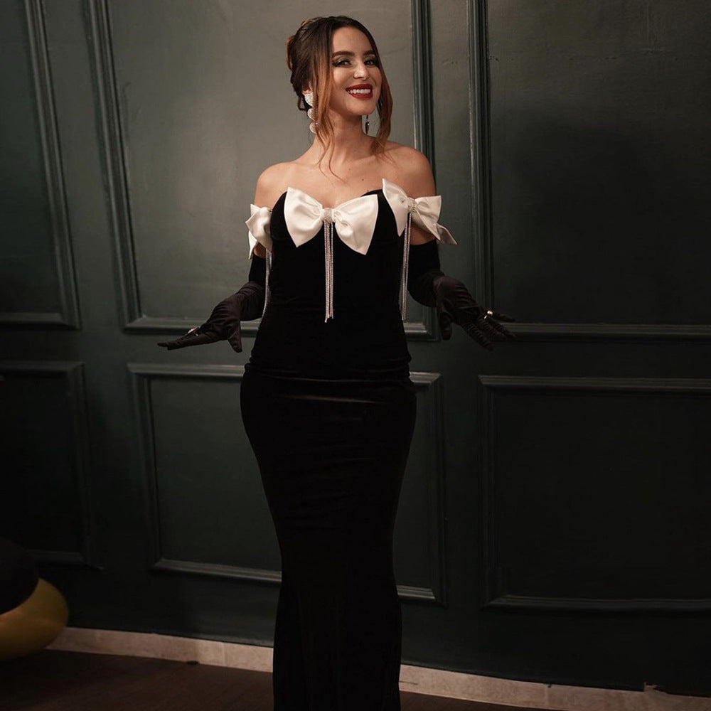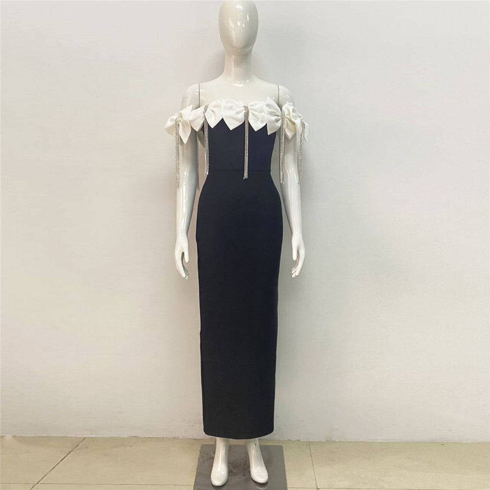 One-Word Shoulder Bow Tuxedo Diamond Bandage Croak Party Long Dress Dress Skirt