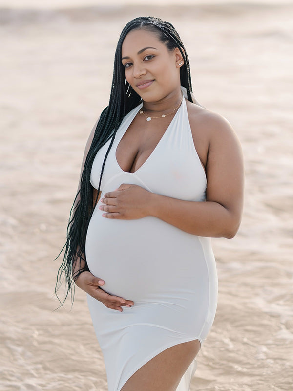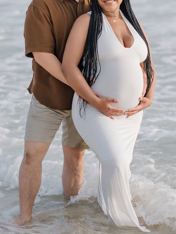 White Side Slit Halter Neck Backless Deep V-neck Bodycon Elegant Cocktail Party Gown Maternity Photoshoot Baby Shower Maxi Dress Maternity