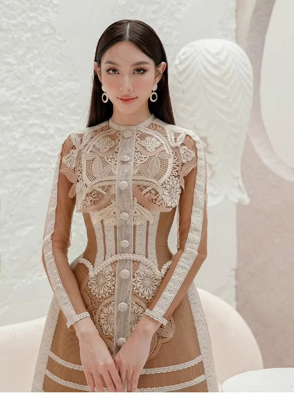 2025 Lace Water-Soluble Flower Hollow Dress Long Sleeve Brown Short Skirt