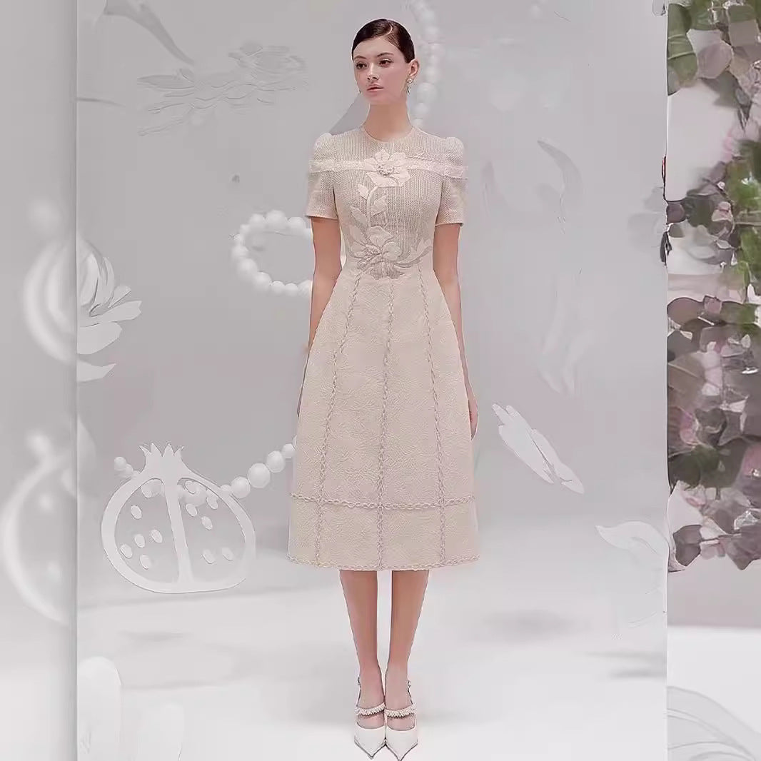 2025 Three-Dimensional Flower Embroidered Hollow Dress Round Collar Short-Sleeved Relief Dress