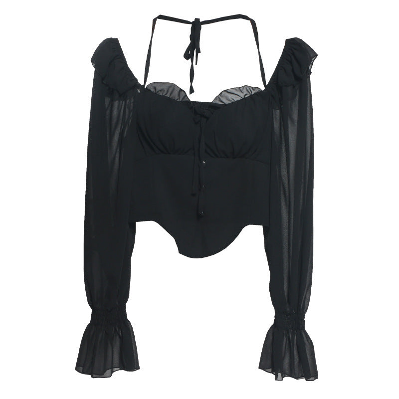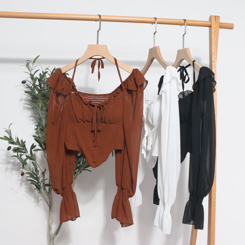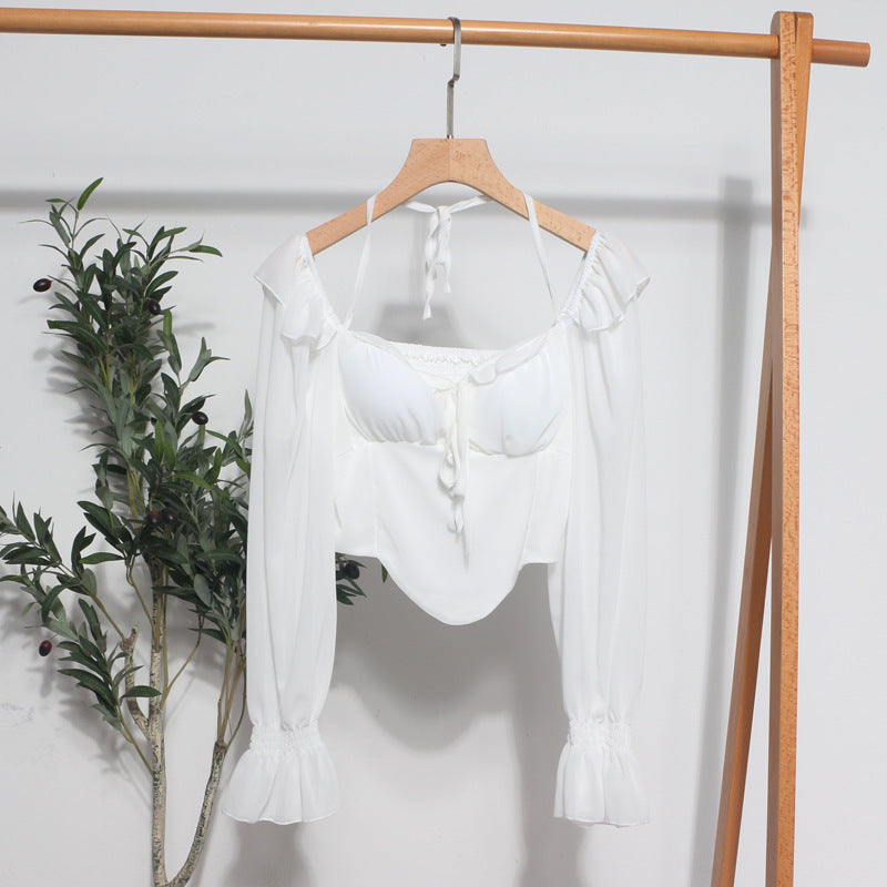 Girls Shoulder-Hanging Neck With Long-Sleeved Slings With Smear Wooden Ear-Deared Shirt Short With Chest Cushion Top DJPT