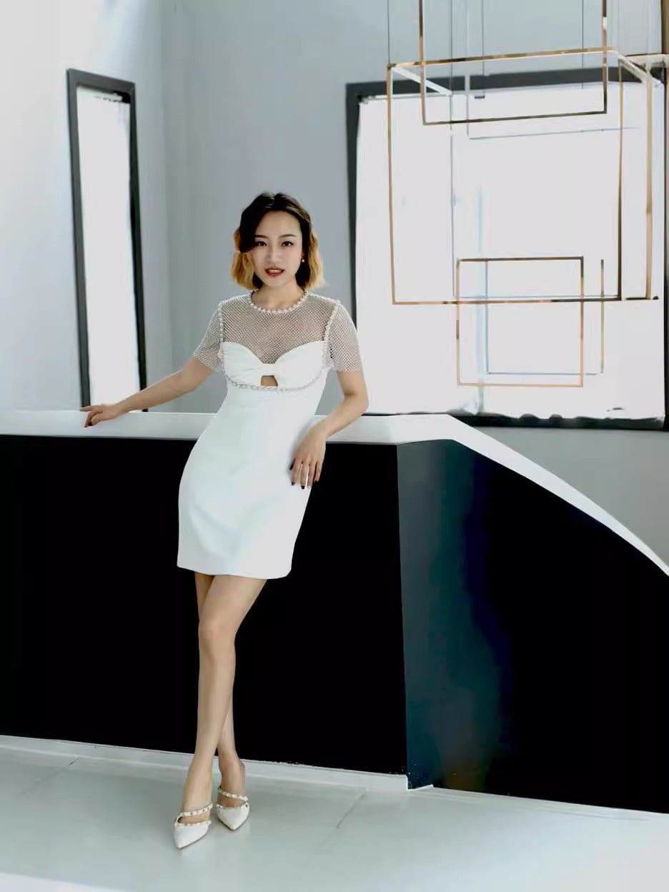 Luxury Niche Nail Bead Dress 2024 Spring And Summer Neckpeel Bow High-Level Feeling Beautiful Female Pure White Short Dress Woman