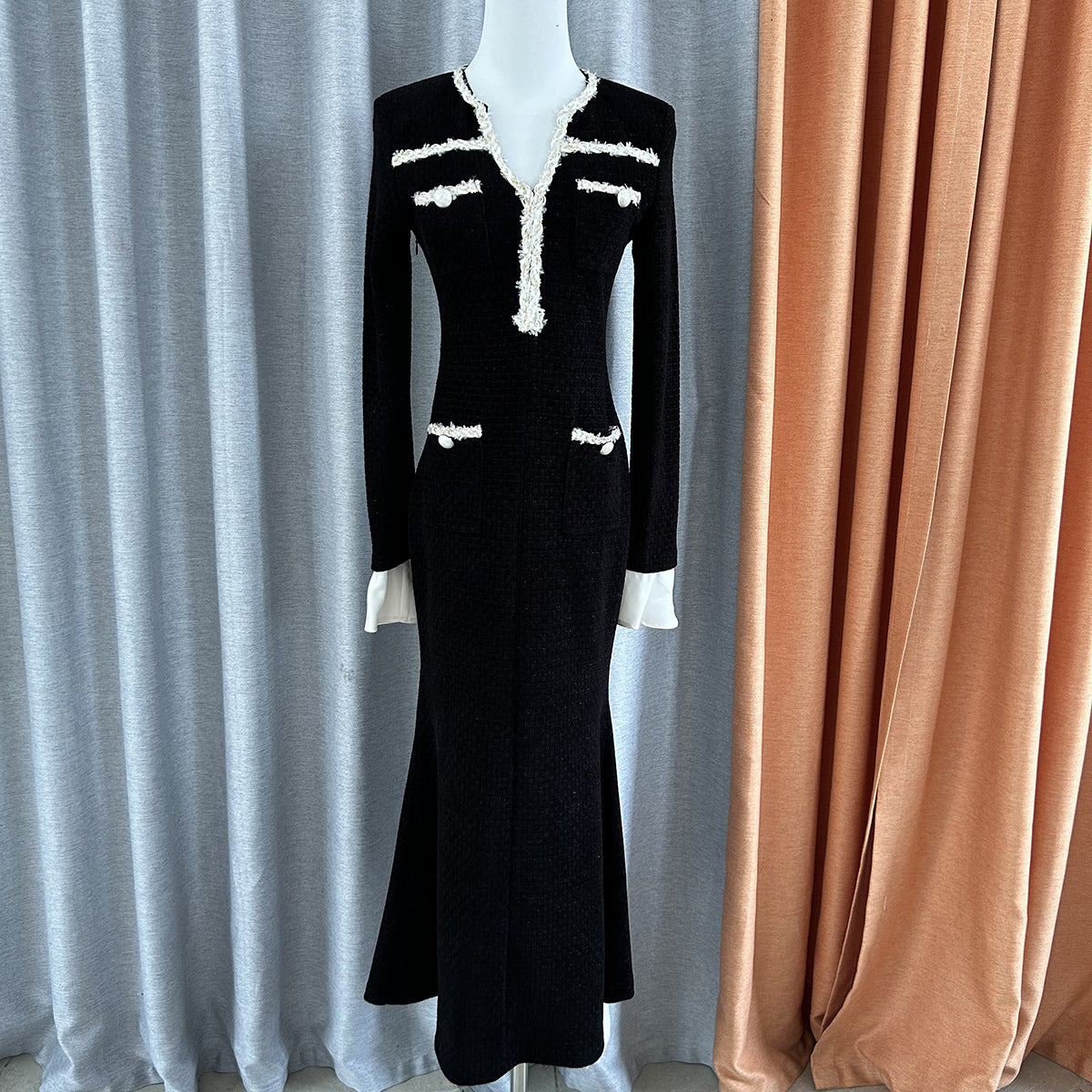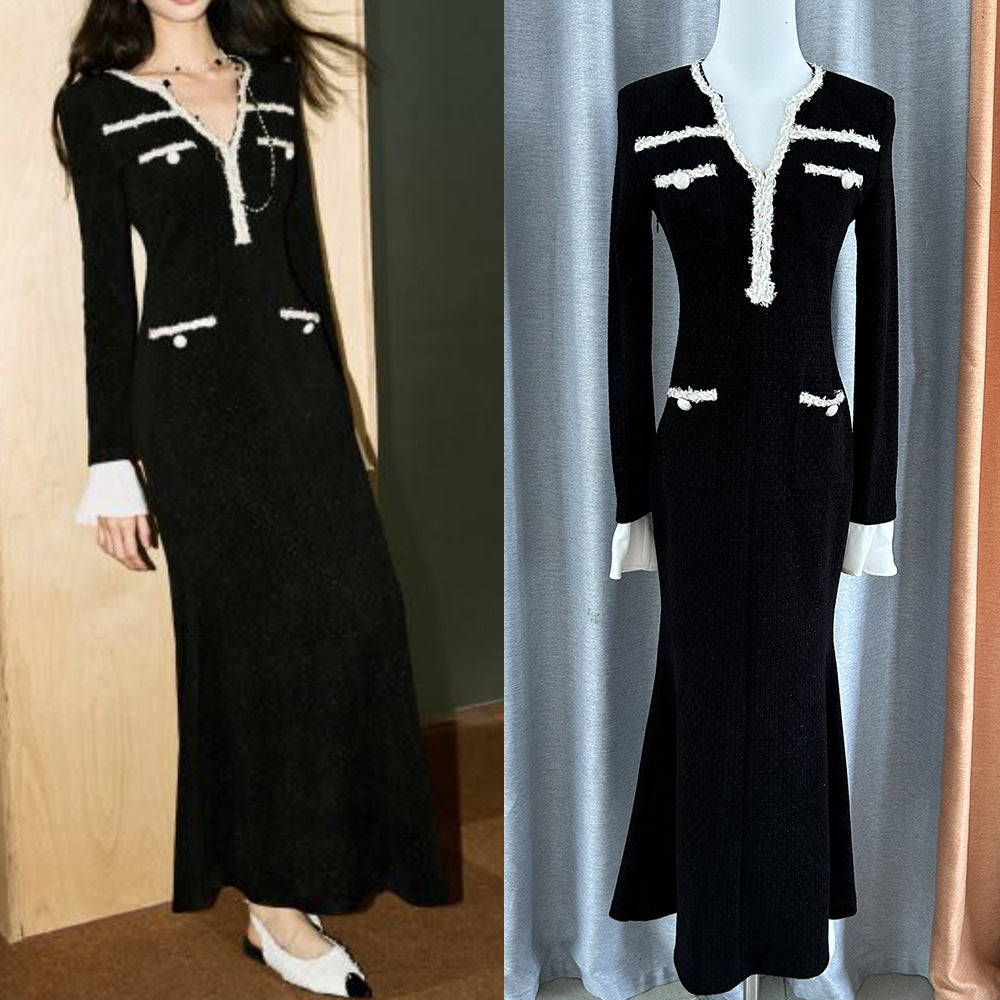 2024 Autumn And Winter Small Fragrant Wind Hit The Fish Tail Waist Dress Temperament High-End V-Neck Long Dress
