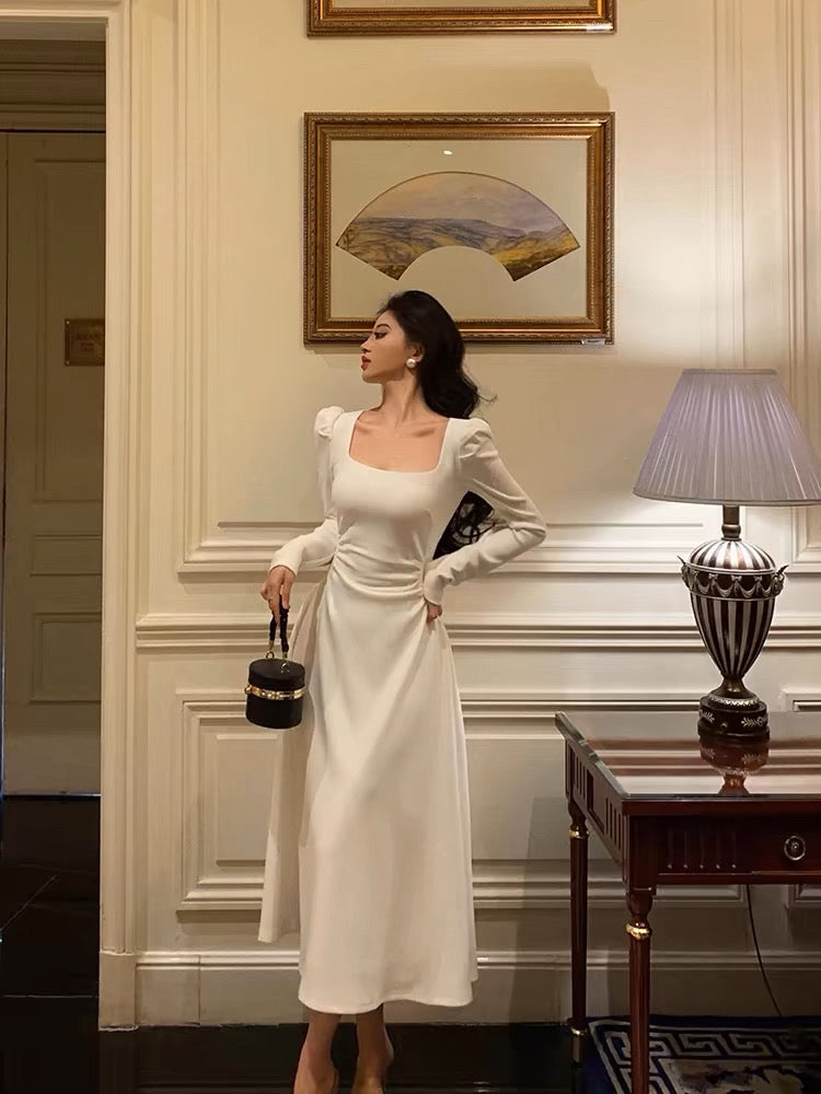 A line Square Neckline Long Sleeves Date Night Dress White Prom Dresses Birthday Outfits SD672