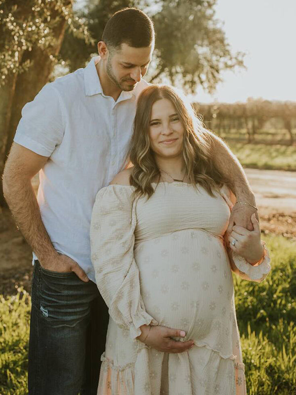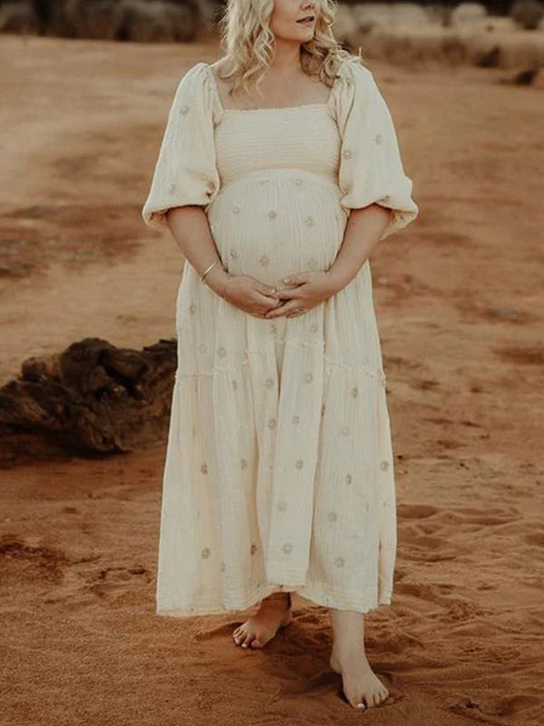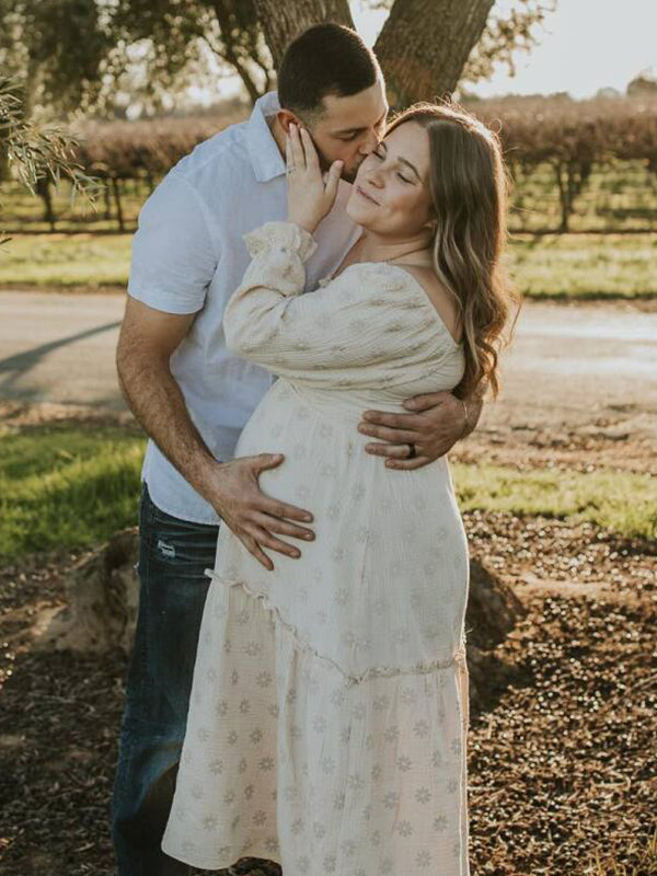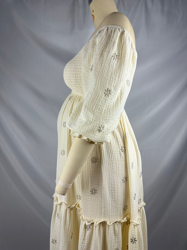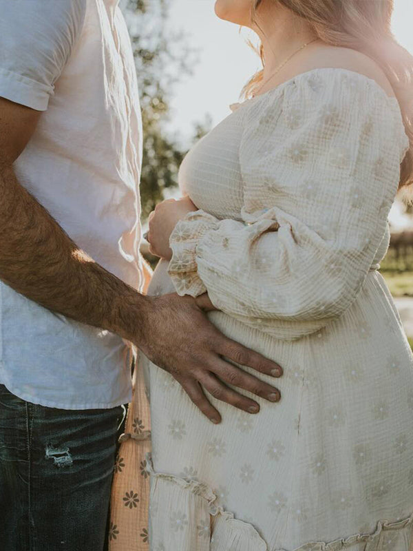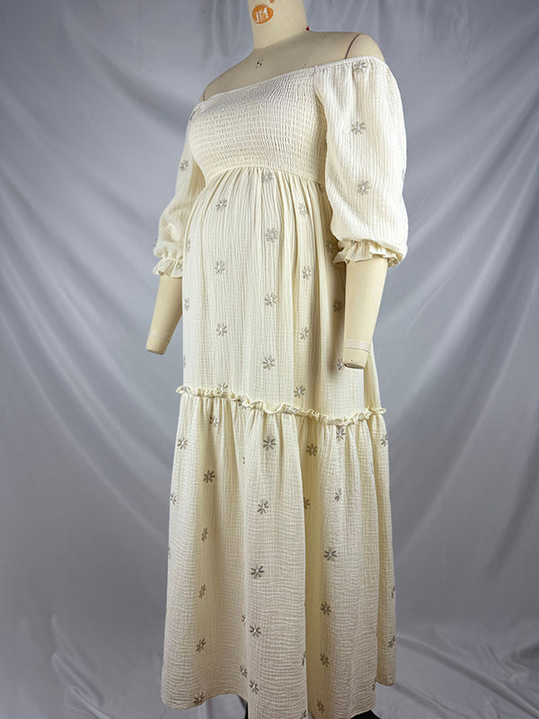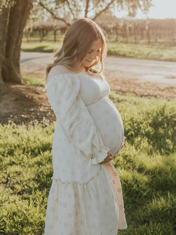 Apricot Daisy Print Smocked Off Shoulder Ruffle Big Swing Elegant Vacation Maternity Photoshoot Baby Shower Party Maxi Dress Maternity