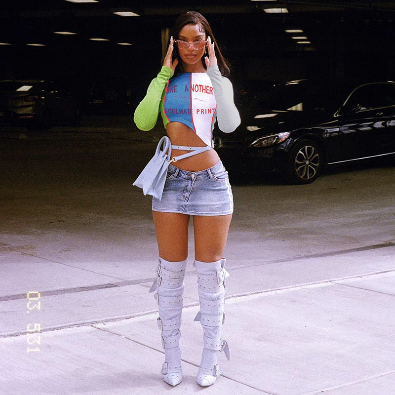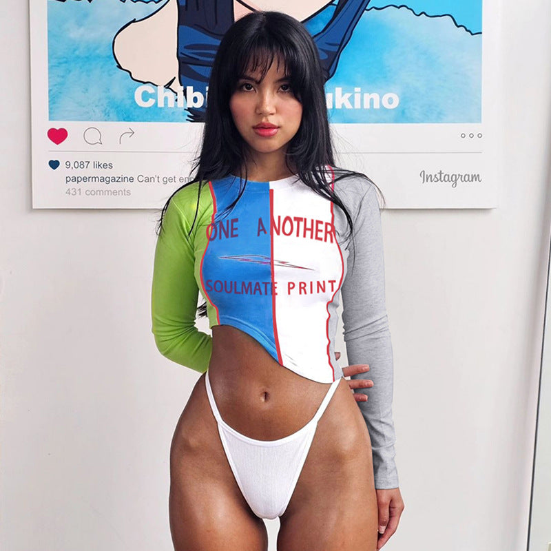 Autumn 2025 New Street Casual Colling Color Print Slanted Strewed Long Sleeve Blouse DJPT