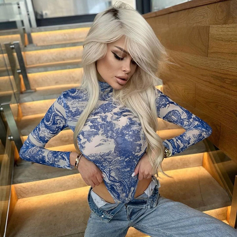 Autumn 2025 New Top Temperament Repair Net Yarn Print Long-Sleeved Dressing Woman DJPT