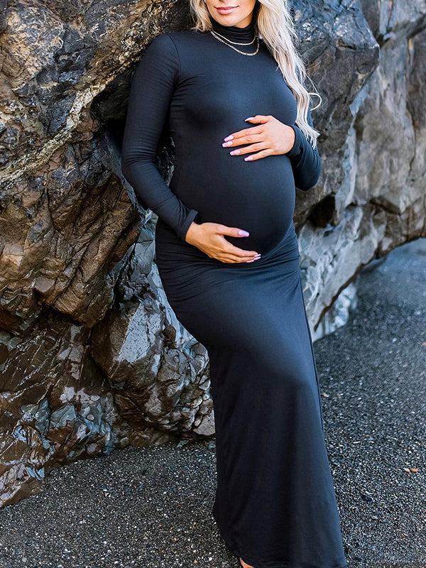 Black High Neck Side Slit Bodycon Long Sleeve Baby Shower Maternity Maxi Dress Maternity