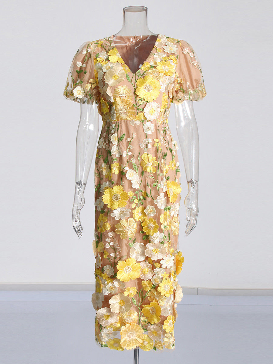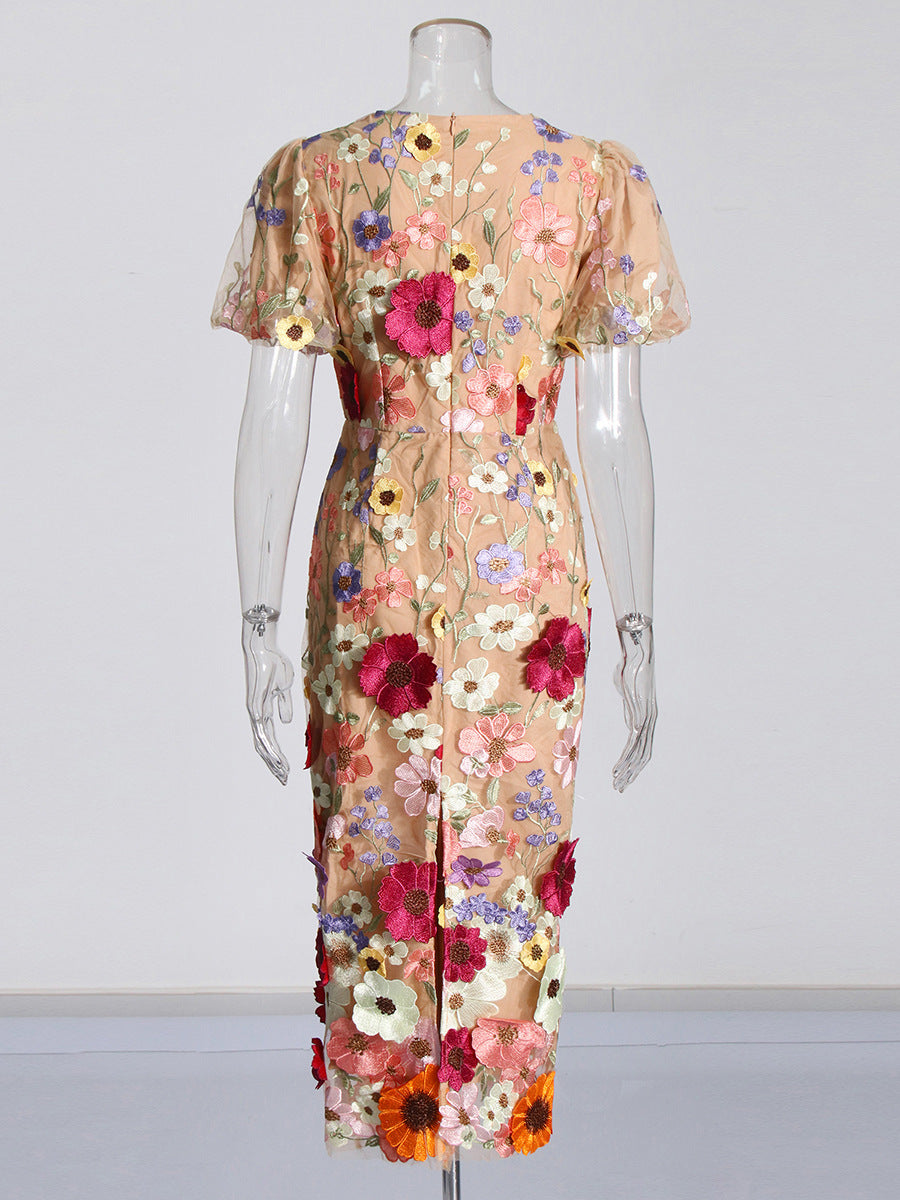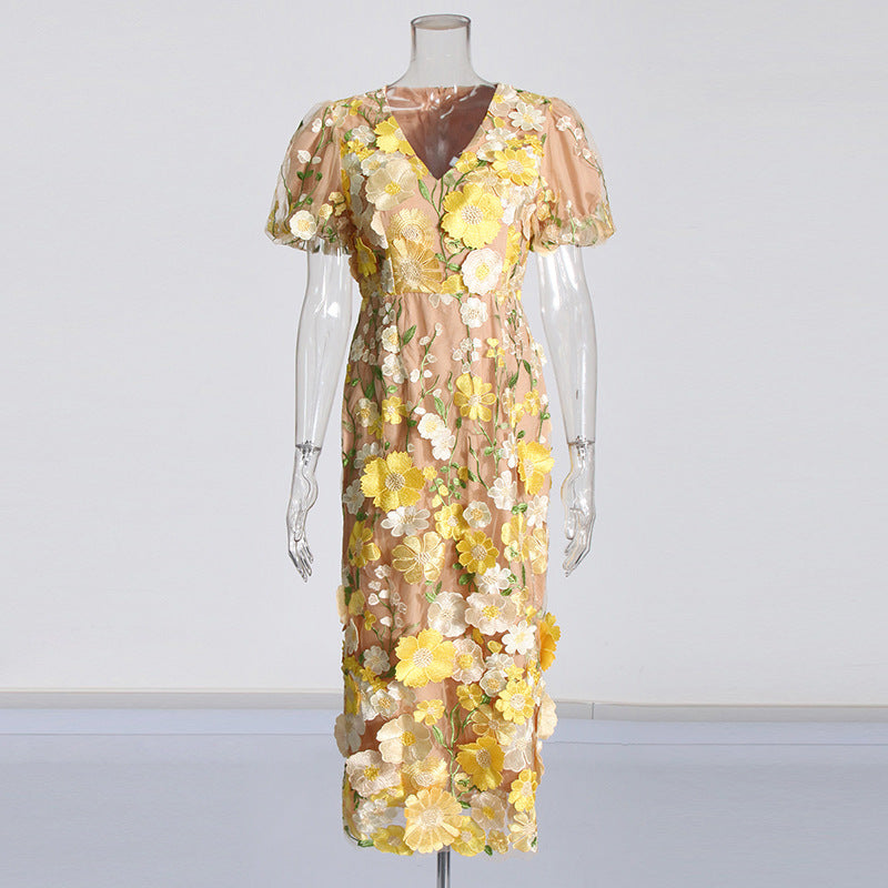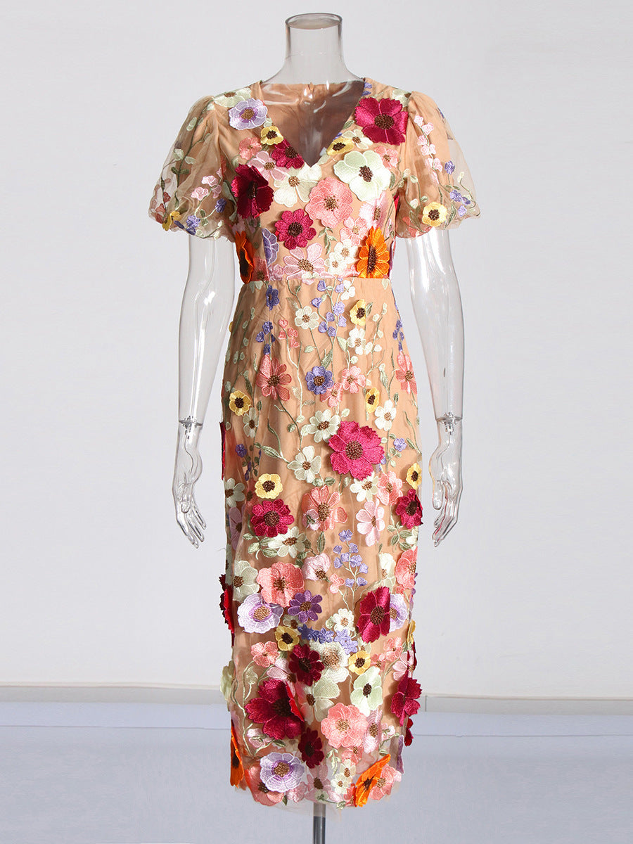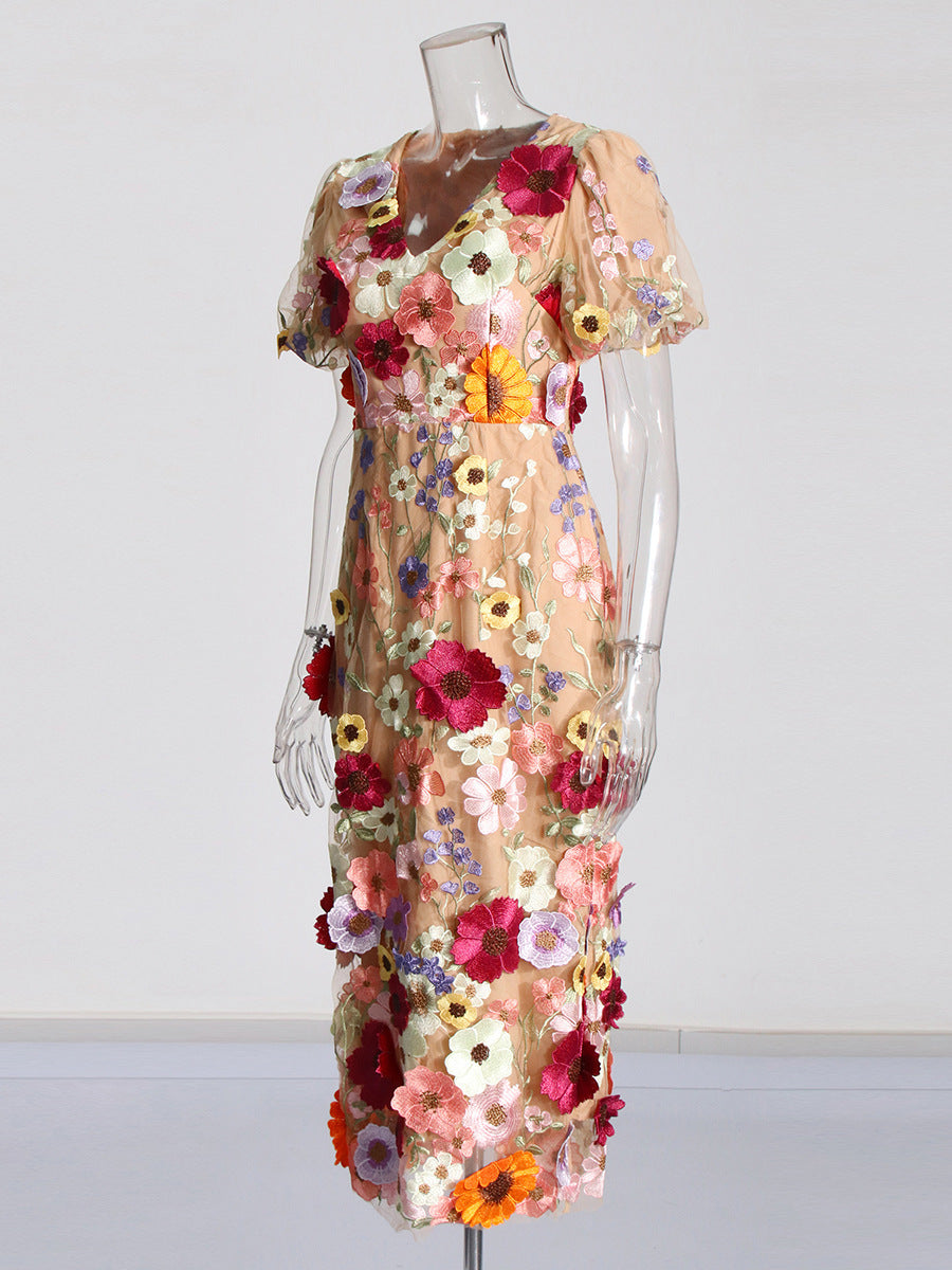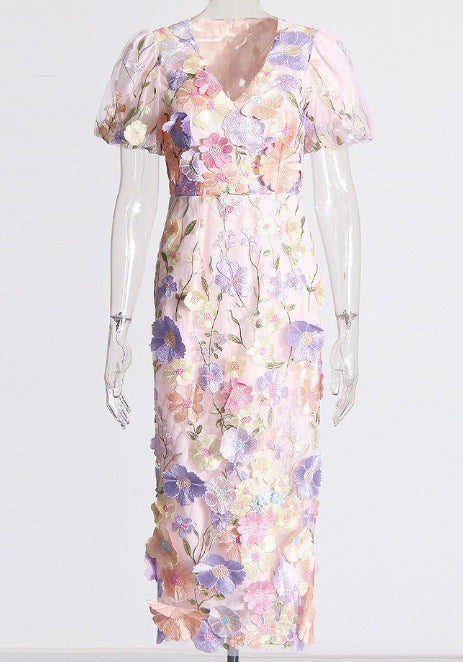 Court Style 2025 Summer New V-Neck Bubble Sleeve Embroidered Three-Dimensional Flower Pencil Dress Female