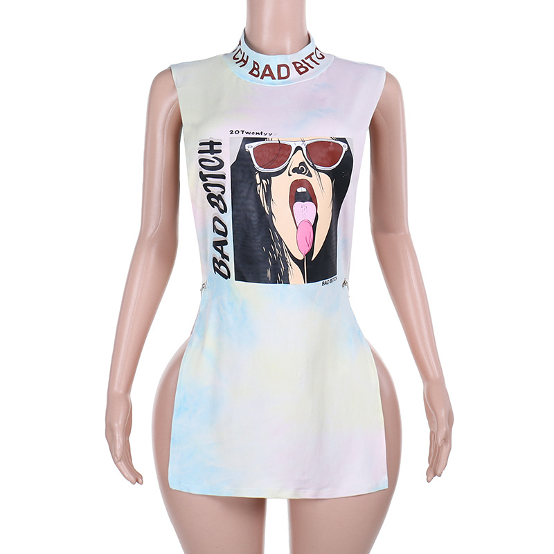 Half-High-Neck Letter Print Sexy Hollow Sleeveless Vest Dress T-Shirt Girl DJPT