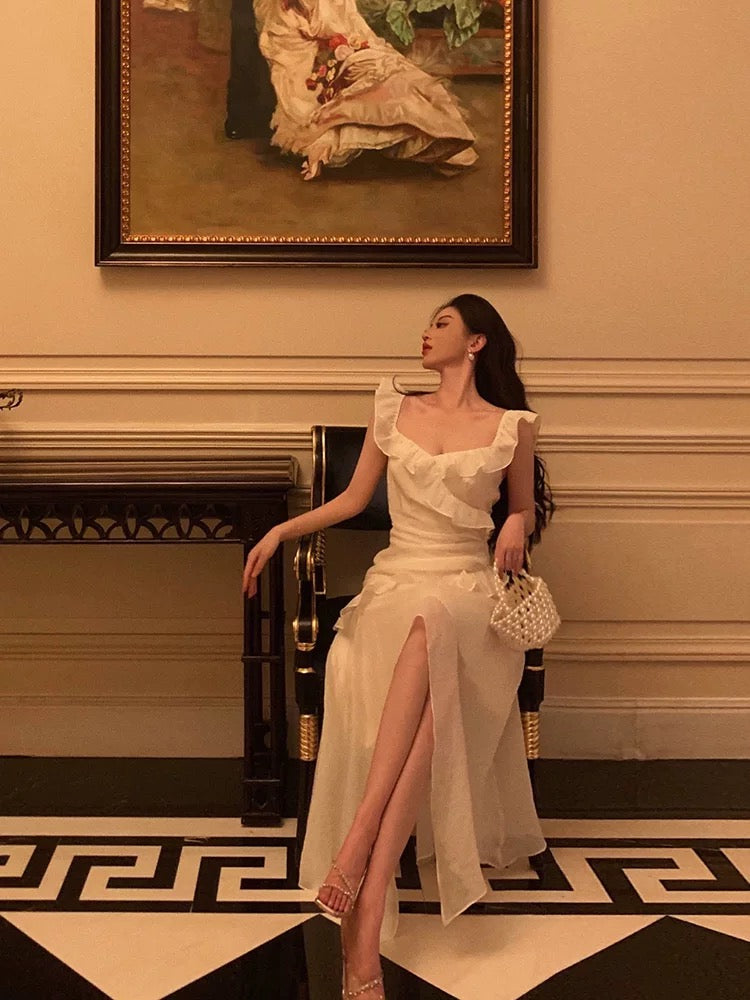 High Low Spaghetti Straps White Chiffon Ruffles Prom Dresses Birthday Outfits Evening Gown SD977