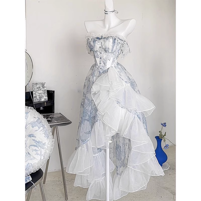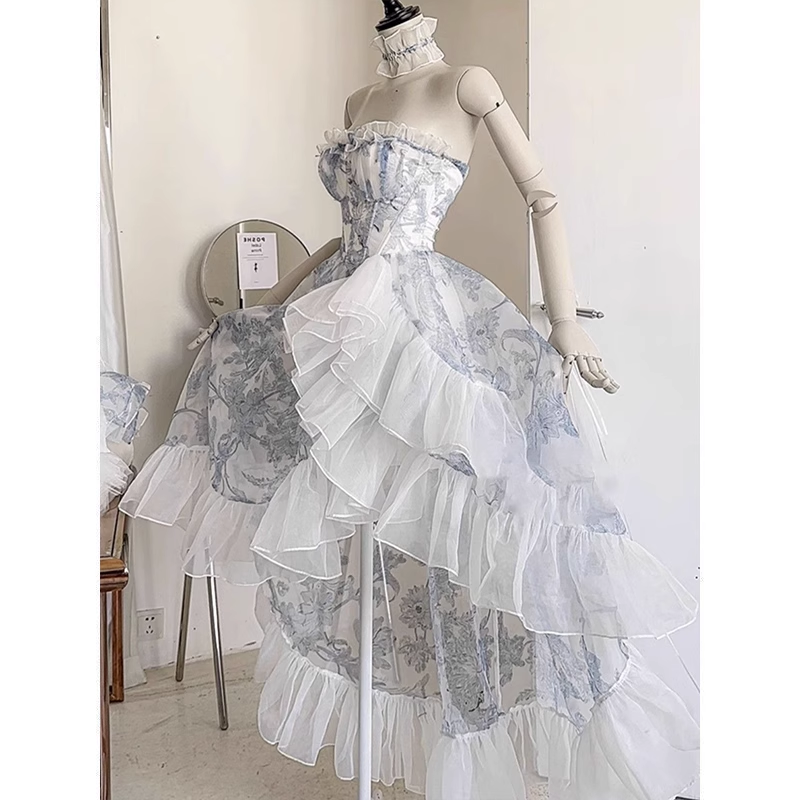 High Low Strapless Floor Length Light Blue Flowers Prom Dresses Birthday Dress SD467