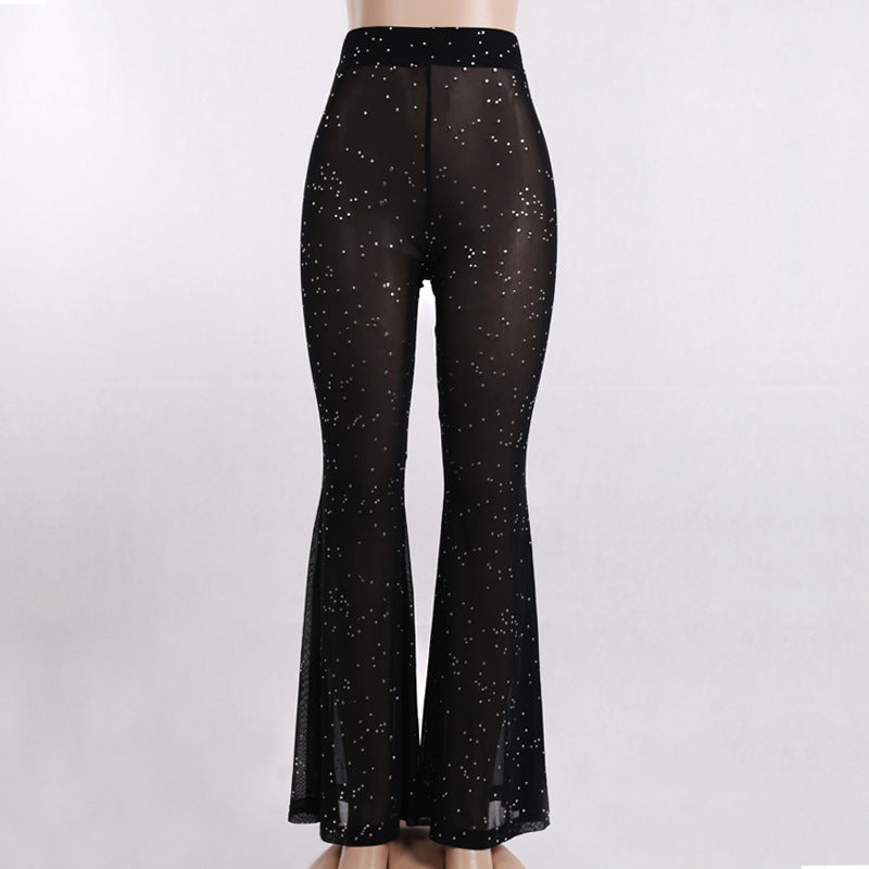High-Rise Mesh Sexy Perspective Drilled Trousers Women In Hot Girls Straight Slacks DJPT